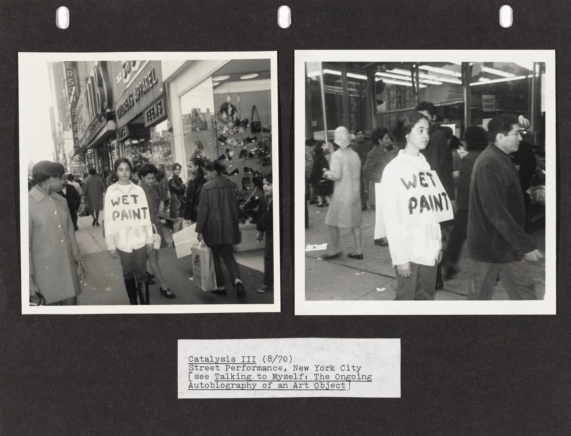 By 1970, Piper was motivated by protest politics to take her work to the streets. In her Catalysis series, she altered her appearance as a social experiment, by donning a Wet Paint sign at a department store, for example.