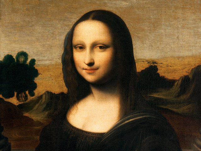 There are numerous differences between the Louvre and Isleworth works. The Isleworth picture has a much simpler background landscape, the columns painted at the sides are more prominent and the sitter appears considerably younger. It is also painted on canvas, whereas the Louvre’s original (and most of Leonardo’s paintings) are painted on panels.