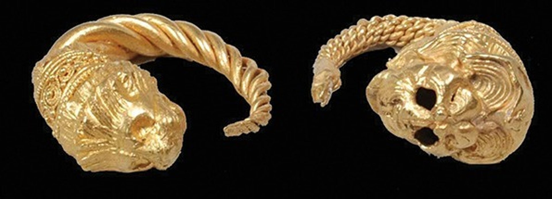 These earrings would have hooked directly through the lobe. They do not form a matching pair, as can be seen from the different designs on the plaited loops, and could be sold individually. The earring on the left shows some granulation, a technique using tiny spheres of metal that reached its peak with Etruscan goldsmiths and declined between the third and second centuries BC. It seems that precious stones forming the eyes of the lion’s head designs are missing from their settings.