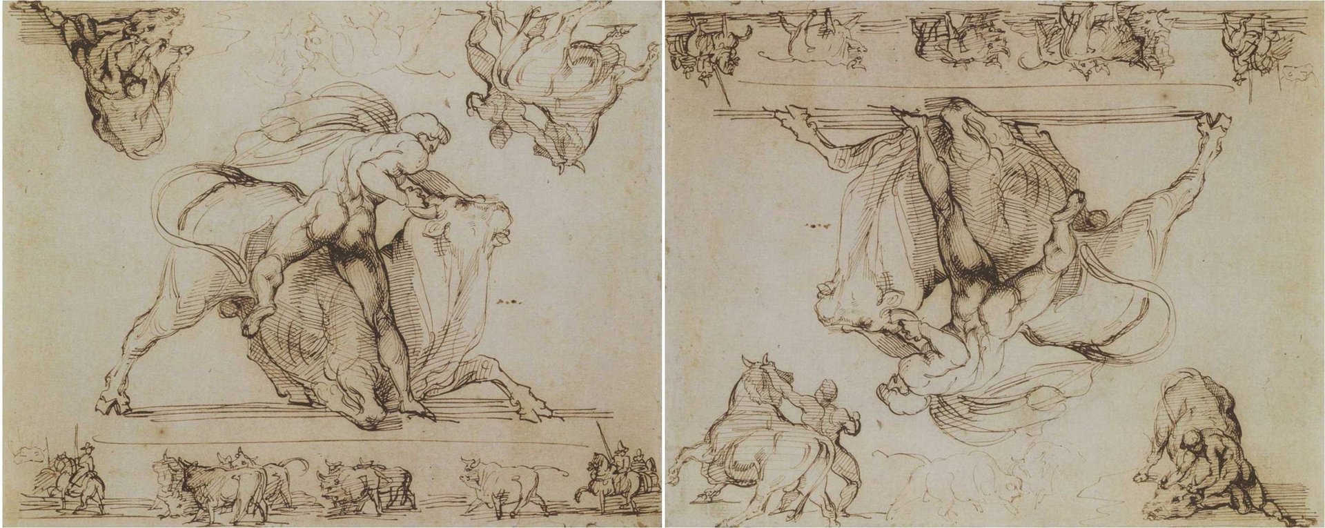 The nudity of the main figure—for it is plainly the same actor in each image—combined with a placeless background renders the scene abstract and apparently timeless. But turning the sheet back to its upright orientation reveals that the ground beneath the struggling man and animal is not so solid. Underneath a series of summary horizontal lines, an orderly, even stately linear procession proceeds from right to left, one that is distinct from the agonistic combat above. Herdsmen with their pikes and broad-brimmed hats take the lead and the rear of their placid steers. The coordination between this lower band and the forms above is subtle and comprehensive: it seals a circular pact between ancient and modern prototypes.