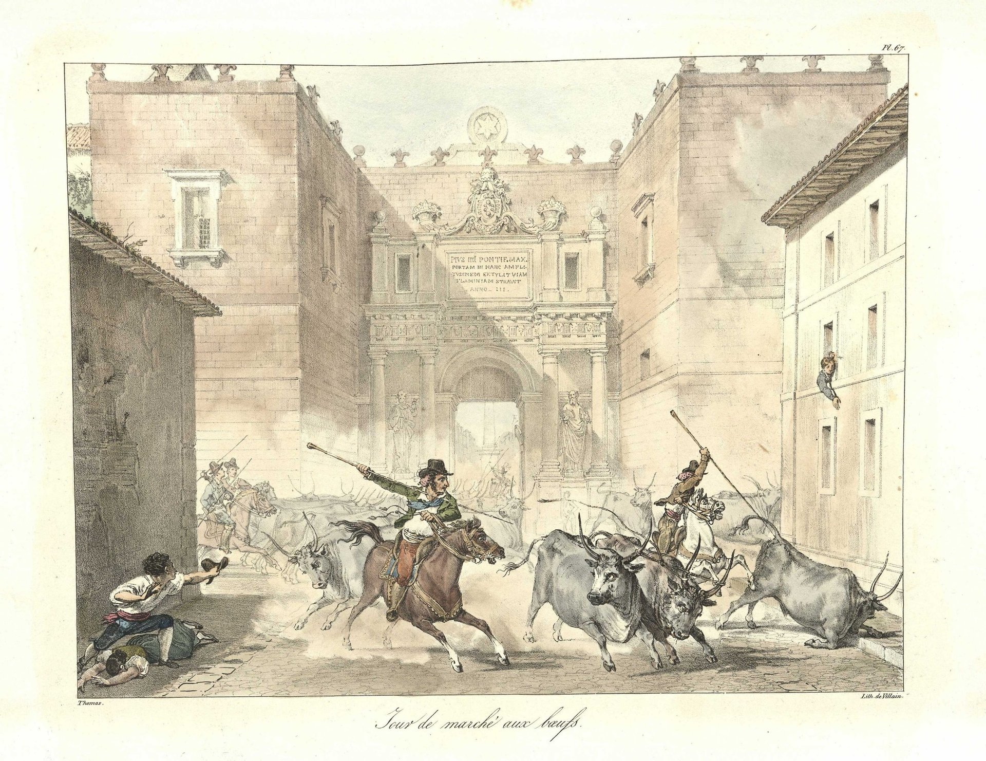 The parallels are at times so strong that one envisions the artists working in tandem at least some of time. In his compendium, Thomas included scenes of herdsmen from the campagna in Rome driving their maddened cattle though the storied Porta del Popolo, the main northern entrance into the city and the central thoroughfare of the Via del Corso. He also recorded the nearby bullfights, then held inside the Mausoleum of Augustus. One powerfully-imagined vignette in a bullfight print by Thomas records a bullfighter single-handedly wrestling a beast to the ground, a spectacle later transmuted by Géricault into perhaps the most astonishing and consummate works of his Roman sojourn: Homme nu terrassant un taureau, 1817.