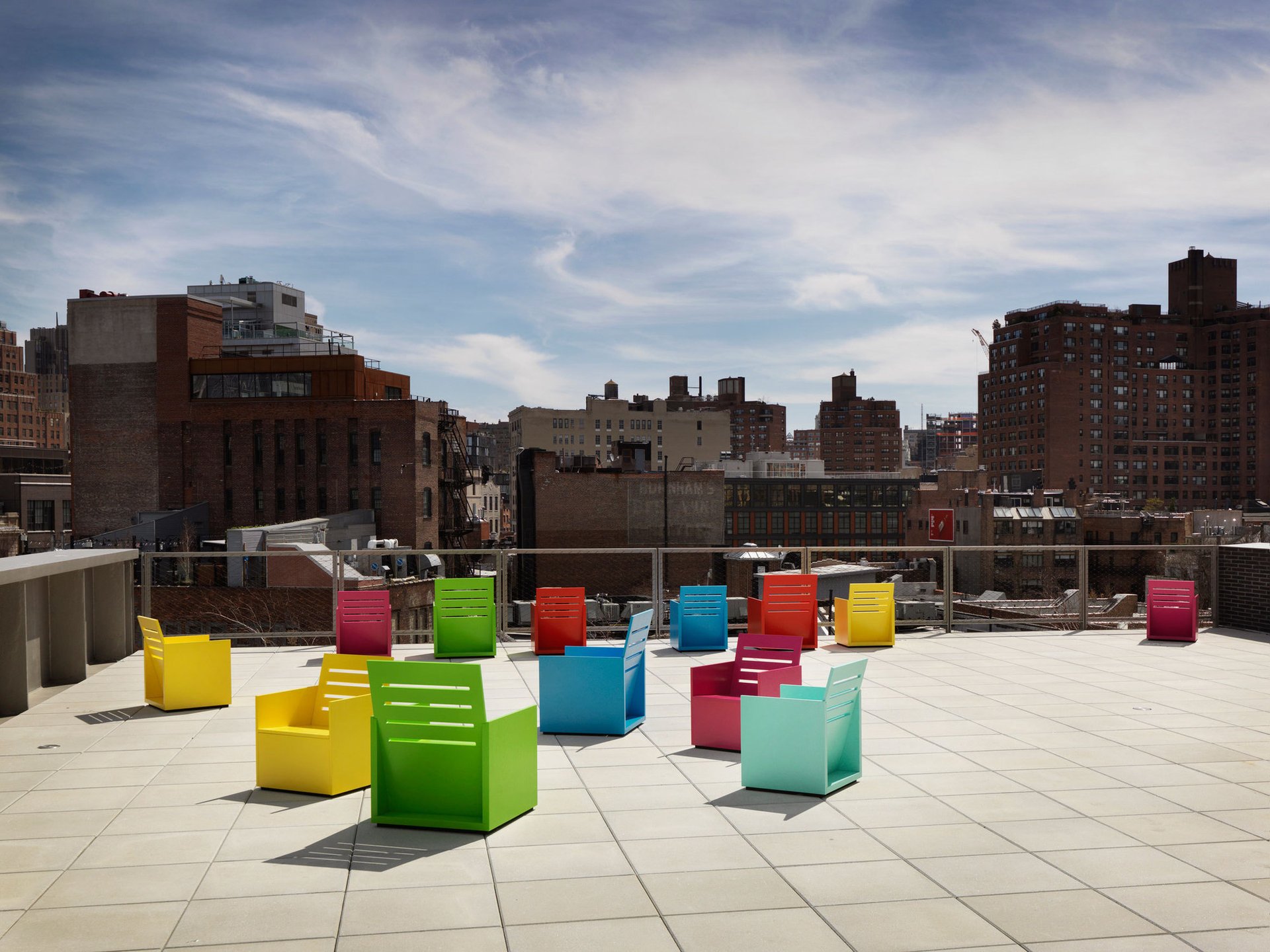 “The experience of getting to the art is part of the art experience,” Weinberg said, and he stressed the importance of allowing for breaks, a consideration that will probably prove necessary as visitors take in the 600-work inaugural exhibition America Is Hard to See. “When you go to a museum, you should be able to take a moment to see the art, you should have a chance to pause. It’s not about getting on a conveyor belt and saying ‘I saw it’.” We took our own welcome moments of respite during the tour—on the fire-escape-like outdoor stairs as we admire the New York skyline, on Scott Burton's granite seating and of course on Heilmann’s cheerful deck chairs overlooking the High Line.