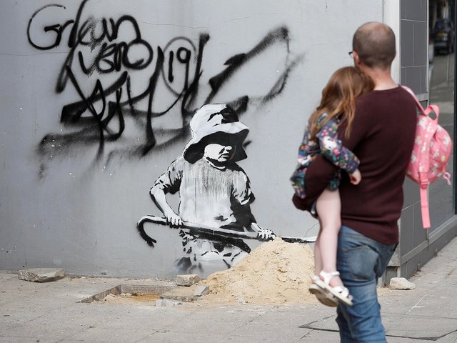 An early work by Banksy and his fellow street artist Inkie, painted on the side of a trailer owned by travellers at the Glastonbury music festival in 1998, is coming up for auction in Paris in June. According to its unnamed owners, who are long-term travellers in the UK, Banksy asked permission before creating the work. “We agreed as it’s easy to paint over had we not liked it,” they say. Silent Majority (1998) shows a sound system landing on a beach. The military-style work is nearly 10m long and comes with a certificate of authenticity from Pest Control, which represents Banksy. It has been removed from the trailer and is due to be sold at Digard Auction on 1 June (est £300,000-£400,000).