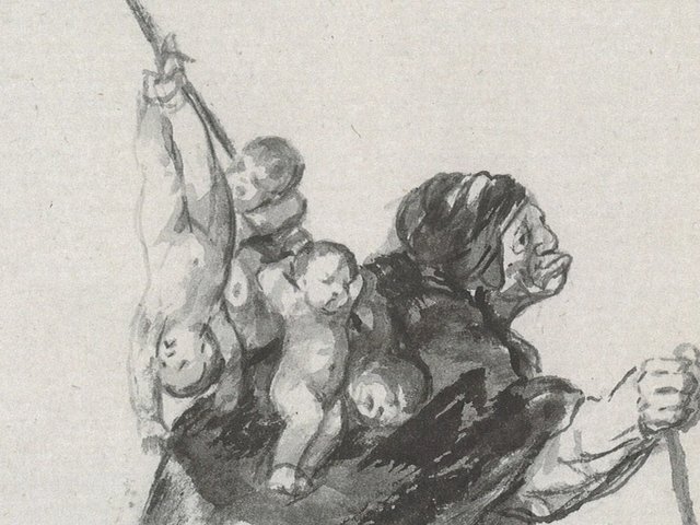 Devotees of witchcraft alternate with oppressed mortals, characters from Spanish literature with figures of Goya’s own invention. And the frailties, indignities and delusions of old age are shared by men and women. A lunatic’s harangue, the avarice of a “covetous old hag”, or the wide-eyed terror of the plummeting, androgynous figure seen in Nightmare are set against the unabashed lust of an airborne couple representing Mirth.