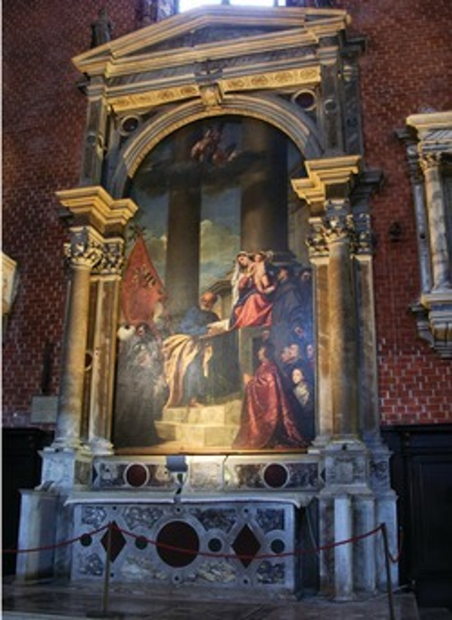 The Virgin as a rocket ship A defining early work by Bellini’s most famous pupil, Titian, also hangs in the Frari, over the main altar. Titian’s Assumption of the Virgin, around 1516 to 1518, was then, and still is, the largest altarpiece in Venice, and its scale and ingenuity astonished his contemporaries. Where Bellini painstakingly crafted quiet, pictorial fidelity, Titian added drama. The work is a swirling mass of bodies, limbs and action, in which the Virgin is propelled heavenwards like a rocket ship. As you walk towards it, your eye is guided upwards thanks to the two saints in red beneath the Virgin; Titian placed them in such a way as to form a triangle of colour with the Virgin herself, who also wears red (albeit with a blue shawl, as tradition decreed). And although the work is strongly lit by windows on either side, it is also cleverly lit from within, thanks to a vivid shaft of sunlight silhouetting the Holy Father. The device was dramatic, but also, for an early 16th-century audience, reassuring, for it provided an echo of the Byzantine gold mosaic arches that had, until then, dominated Venetian church architecture.