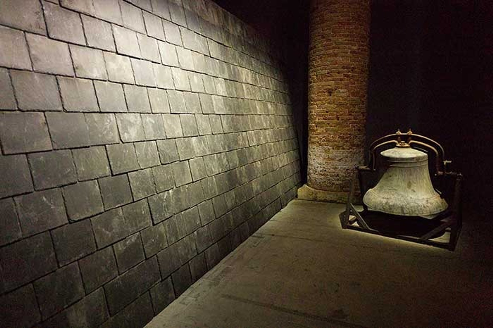 A bronze church bell, a wall of slate roof tiles, a mostly-complete statue of a saint: these are the items that Gates and his team have salvaged from the now-demolished Roman Catholic Church of St. Laurence in Chicago, which was built in 1911. The Joseph Molitor-designed church, which gradually fell into disuse, was on the border of changing ethnic and denominational communities. Gates uses the semi-demolished church interior to screen an affecting, atmospheric video filmed with his collaborators, the Black Monks of Mississippi: two powerful performers raise and drop heavy church pews to an irregular beat while a cello plays softly and, in the background, a blues-gospel chant creates a lyrical, elegiac mood.