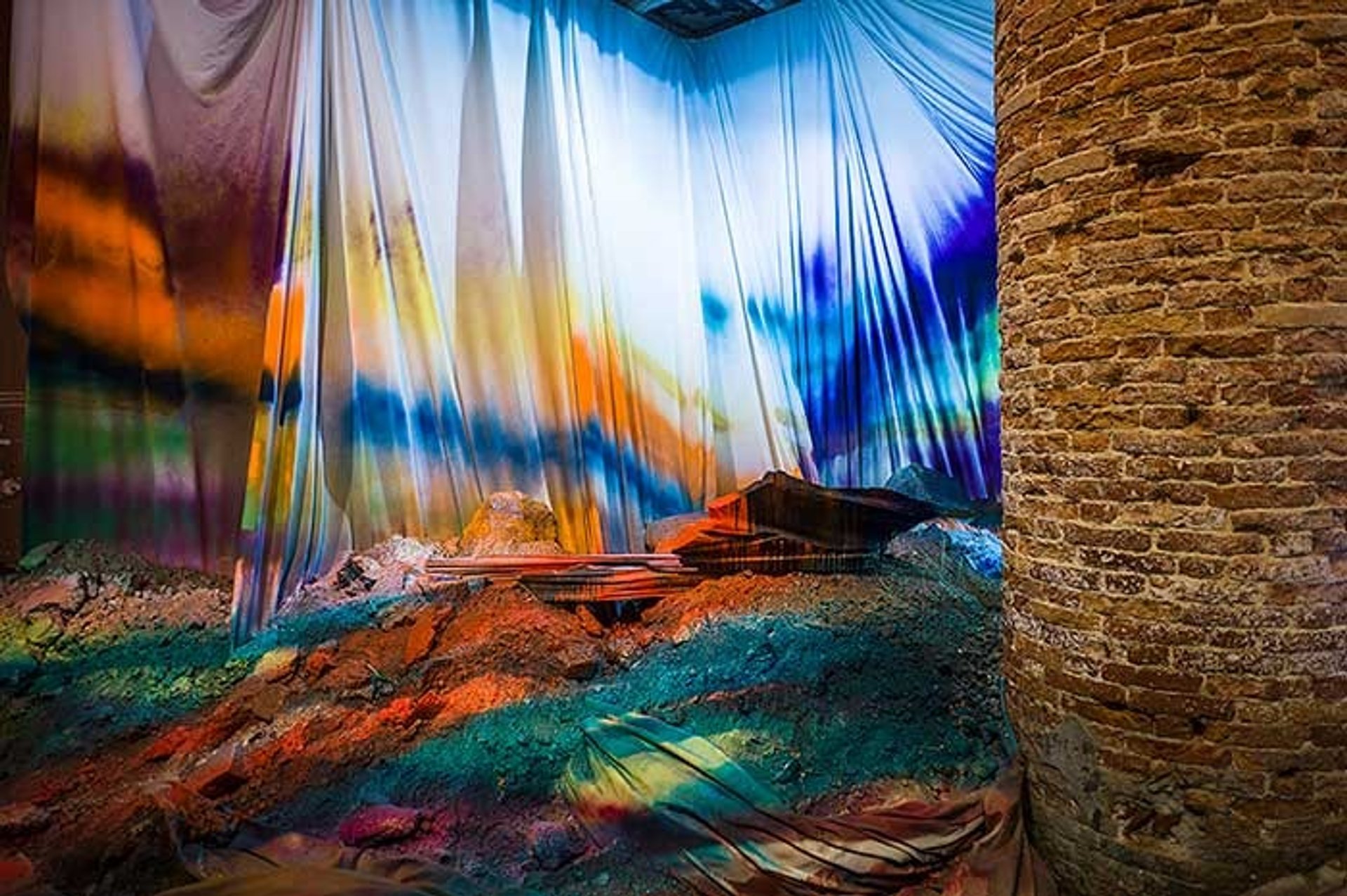 Katharina Grosse, Untitled Trumpet (2015) After the subdued, largely black-and-white colour scheme of Enwezor’s show in the Giardini, Katharina Grosse’s psychedelic, Technicolour installation in the Arsenale comes as a bit of a shock. Untitled Trumpet (2015), which fills an enormous gallery, looks like a spray-painted alien planet: fabric painted in purple, yellow, green and red is draped over the walls and gravel covers the ground, painted in the same colours. It is unclear whether you have just stepped into a bright abstract painting or some version of Mars imagined in the 1970s.