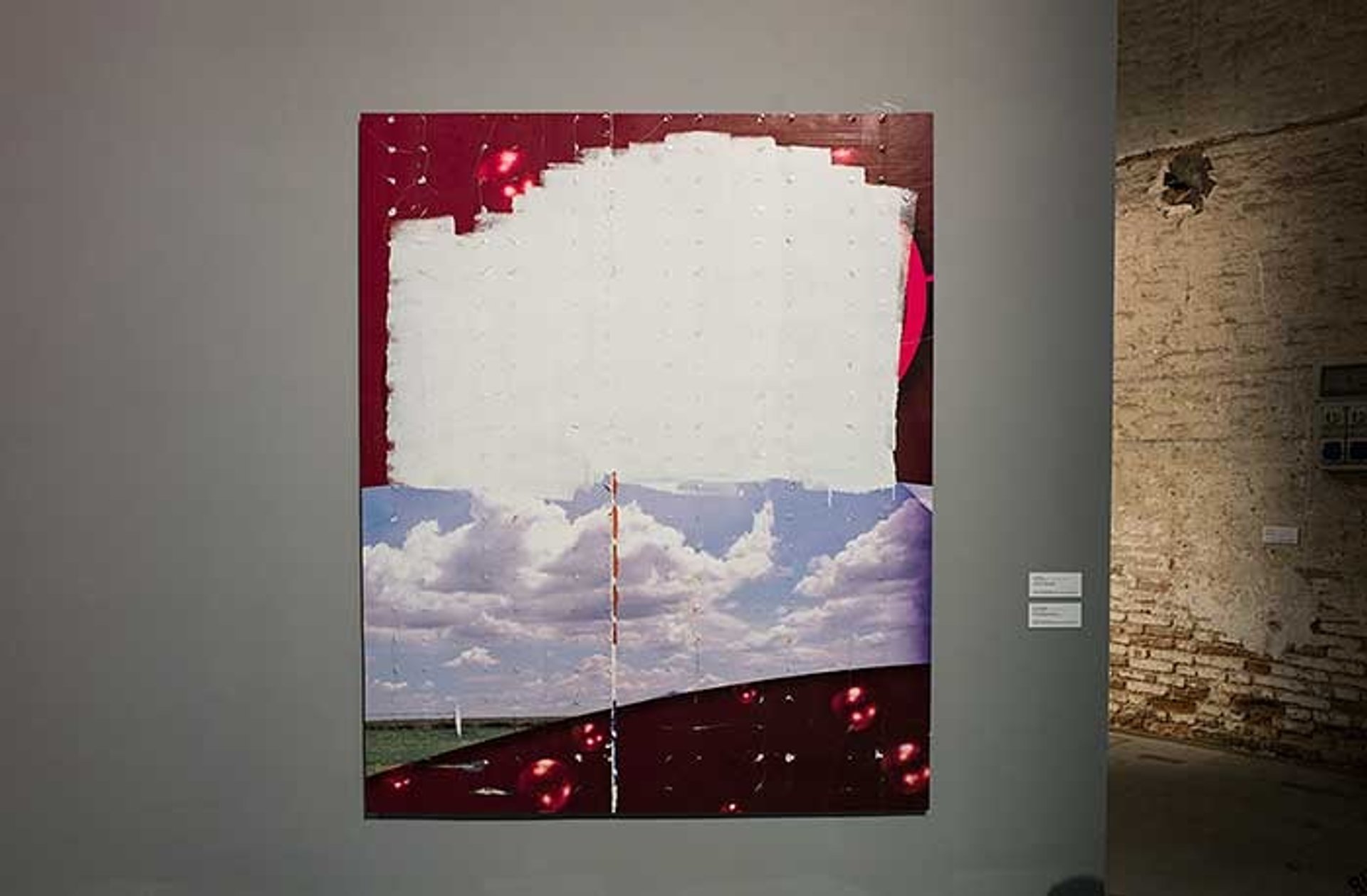Sibony’s works are all on the surface, but that is not a slight: painting is necessarily only about what is immediately visible. It is impossible to dig deeper than what his paintings present us with. A picture like A Month of Saturday (2015) is beautiful in the simplest way. Atop a re-purposed aluminium sheet (it used to be part of a trailer) is a swath of white paint. Below that is a picture of some clouds and grass. Does any of this relate to the title? It is impossible to say, and perhaps only Sibony knows for sure. What we see is beyond interpretation, but we do not need to make sense of good painting. All we need to do is look at it. Sibony’s work, especially because it is casual and easy, is a moment of respite in an otherwise busy and sometimes intellectually overwrought exhibition.