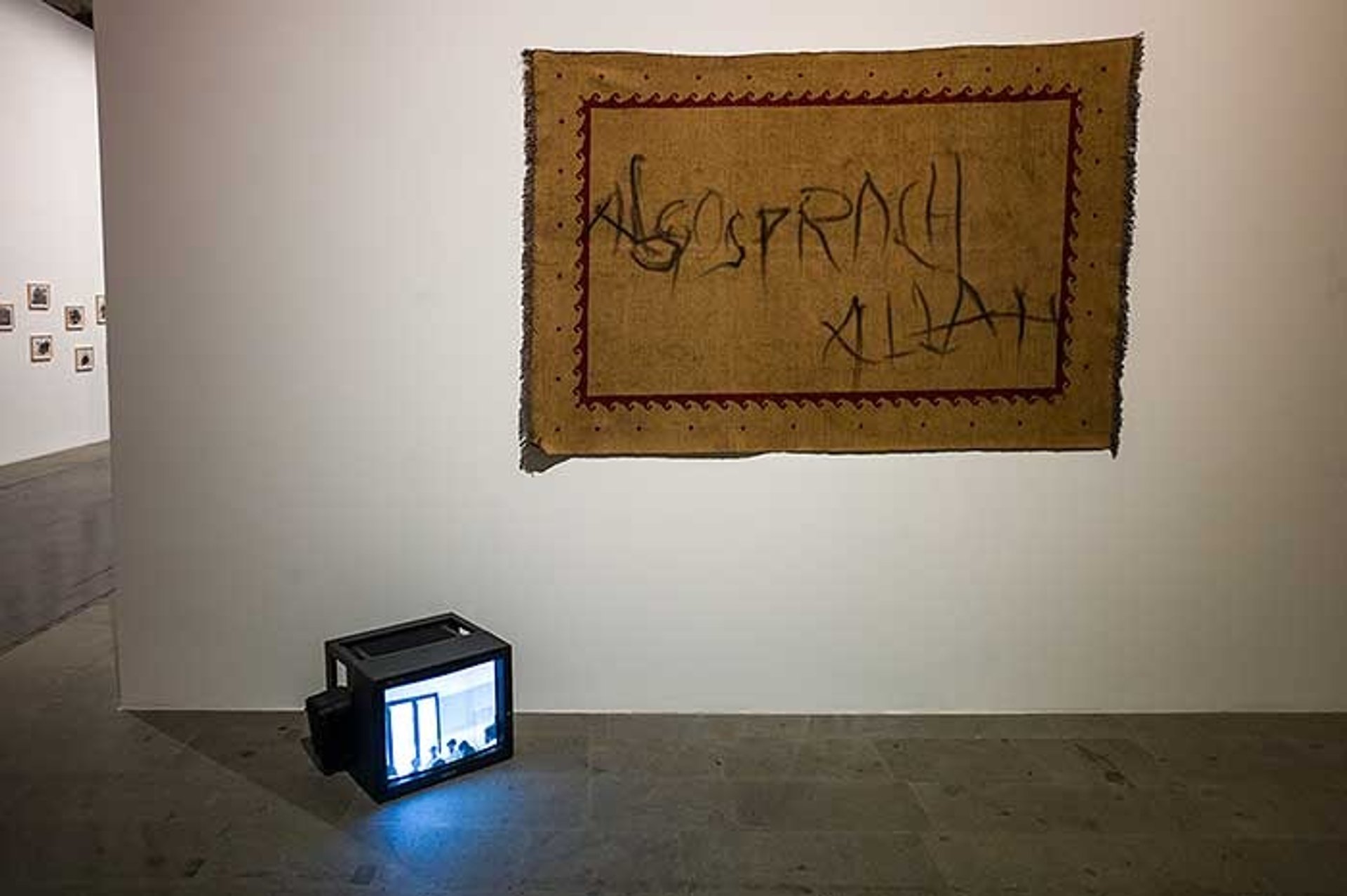 Visitors entering the Arsenale see a crude carpet emblazoned in clumsy, illegible daubs that read “Also Sprach Allah,” which translates as “Thus Spoke Allah”. An accompanying video documents how this work was made: it shows Abdessemed cradled in a blanket, being tossed into the air by a group of men. With each throw, he adds a mark to the carpet, which is pinned to the ceiling (the impressions eventually spell out the eponymous title).