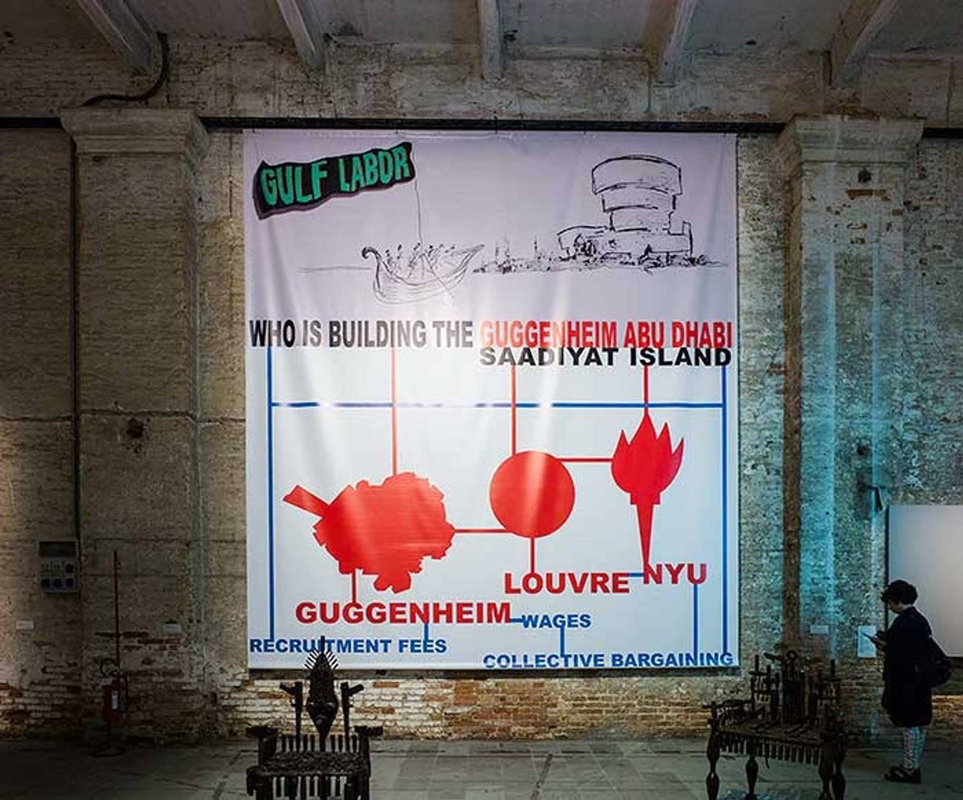 Gulf Labor, Who is building the Guggenheim Abu Dhabi (2015) Many works in Enwezor’s exhibition touch on broad themes such as capitalism, colonialism and inequality. But Gulf Labor’s Who is building the Guggenheim Abu Dhabi (2015) looks at those issues in a way that hits home for the art world. Since 2010, this international group of artists has been raising awareness of the plight of migrant workers building cultural centres in Abu Dhabi. This work in the Arsenale, a large poster, paints a simple picture: the Guggenheim, the Louvre and New York University are developing projects in the oil-rich emirate that neglect worker welfare. This is the second Venice outing for Gulf Labor so far: its campaign is also included in Hans Haacke’s, World Poll (2015), a 20-question iPad survey in the Giardini. But here, Enwezor has possibly provided the group with its most visible soapbox.