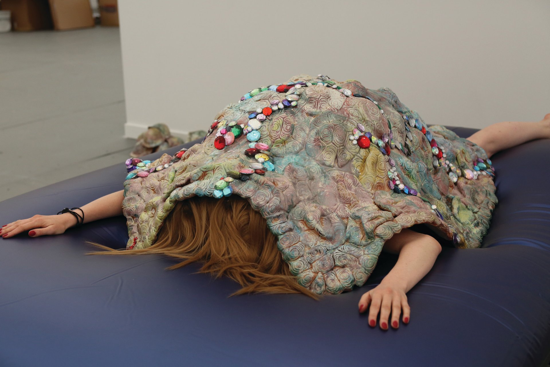The Estonian artist Kris Lemsalu is comfortable in her own shell. So comfortable that she’s spending most of Frieze New York splayed out on a waterbed beneath a bejewelled-porcelain turtle shell at Temnikova & Kasela Gallery (B28). Lemsalu gets through the durational performance by listening to music through headphones—R. Kelly is a particular favourite—and meditating. “It’s a really powerful state I go into; sometimes I think I could go on like that forever,” she says. But she can’t, and when she needs a break she will drop a napkin onto the floor to cue her dealer to release her. “I’ll come out, have a glass of champagne, then go back in,” she says. Lemsalu is still deciding whether she considers it a performance or a sculpture: “I think I want to be one of the materials,” she says.