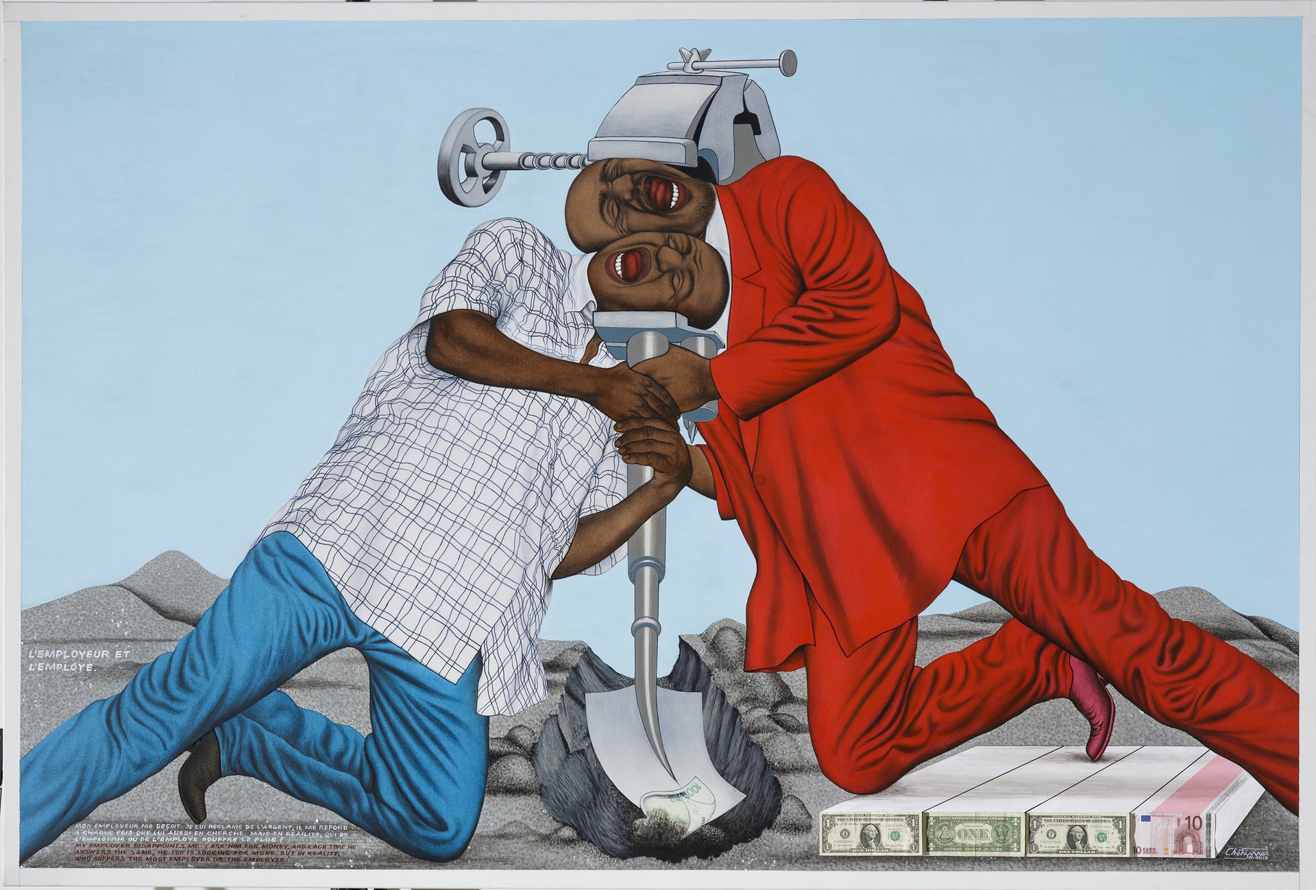At the more expensive end of the spectrum, two canvases by the Democratic Republic of Congo "popular painter" Chéri Samba are particularly eye-catching at the Parisian gallery, Magnin-A; one depicts two men with their heads clamped in a vice (priced at $72,000) and the other is a self-portrait of the artist with a pencil in his mouth ($96,000).