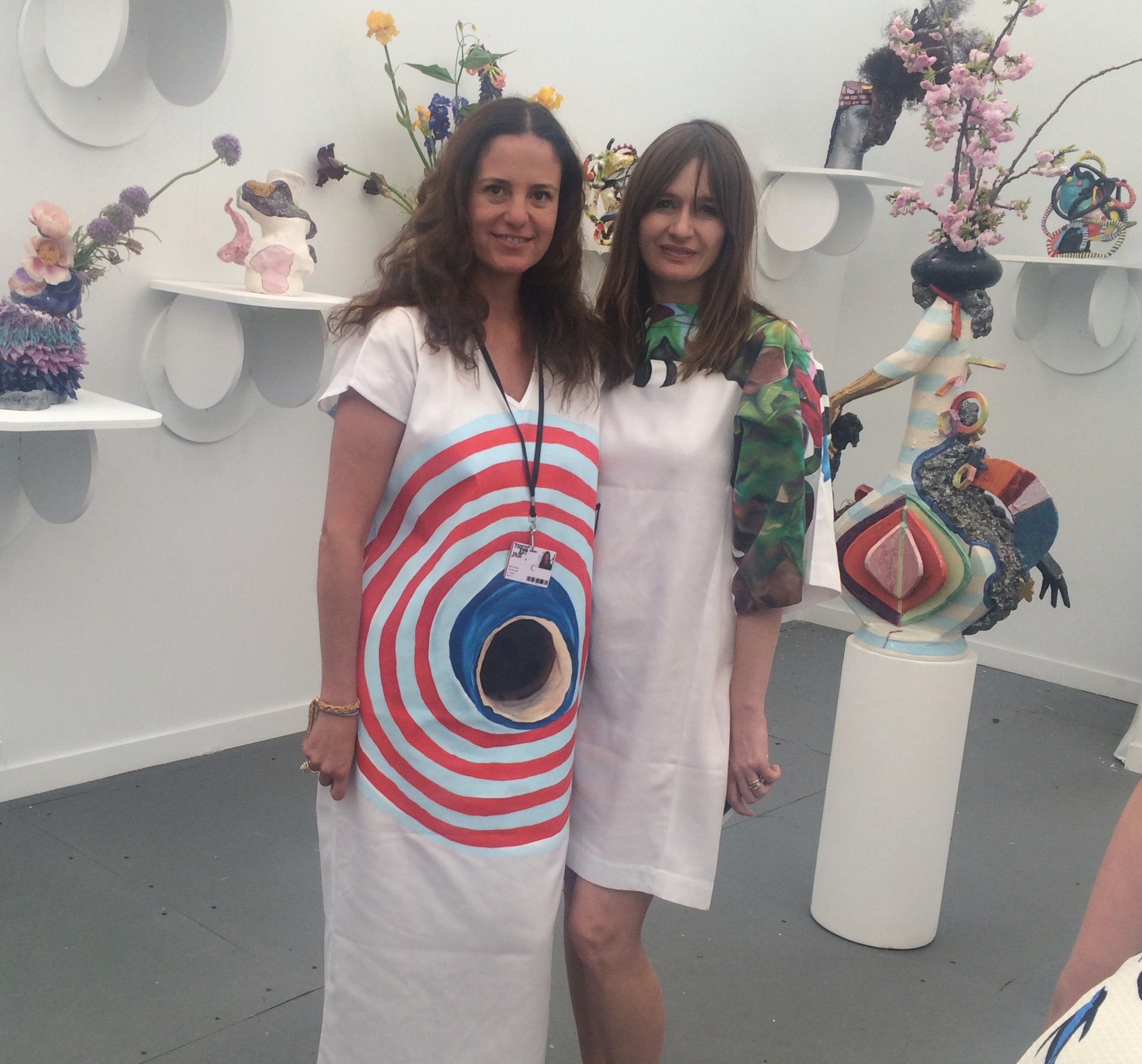 The Madrid gallery Travesía Cuatro could well be the fairest booth of the fair, thanks in part to an appearance on Wednesday by the English actor Emily Mortimer. To support her friend, the Mexican artist Milena Muzquiz, the Newsroom star sported a dress inspired by Muzquiz’s ceramic vases, which are on display at the gallery, filled with blooms of exotic flowers. “I’m hoping one will be chipped so I can have it,” Mortimer says. The old pals met when Mortimer’s now-husband, actor Alessandro Nivola, was researching a role for a film about the music industry and discovered Muzquiz’s band, Los Super Elegantes (who later played at their wedding). Mortimer came out again on Thursday night to see the band play the Hotel Americano, on a set designed by Muzquiz’s husband, the artist Jorge Pardo.
