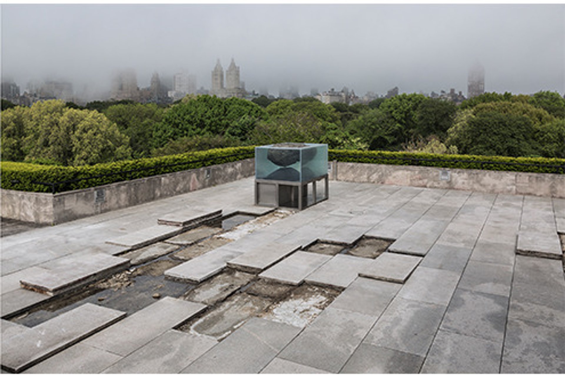 Huyghe’s anti-monumental intervention on the Met’s roof initially looks as if the builders have been in: flagstones are uprooted and filled with murky puddles, and a large tank of waterborne creepy crawlies periodically clouds over and appears to have sprung a leak…Of course this studiedly casual appearance belies a complex feat of engineering and the whole work is a meticulously contrived meditation on the passage of time, which holds a direct conversation with the Met’s own holdings. Cutting-edge liquid crystal technology fogs up the tankful of primeval lampreys and tadpole shrimp, while the lone boulder of Manhattan Schist, which has also come to rest on the roof, is in fact part of the bedrock supporting the wraparound high rise skyline and dates back 450 million years. But the weeds and bugs accumulating around the excavated flags are changing minute by minute—as Huyghe himself says, “the important thing is not necessarily the big event.”
