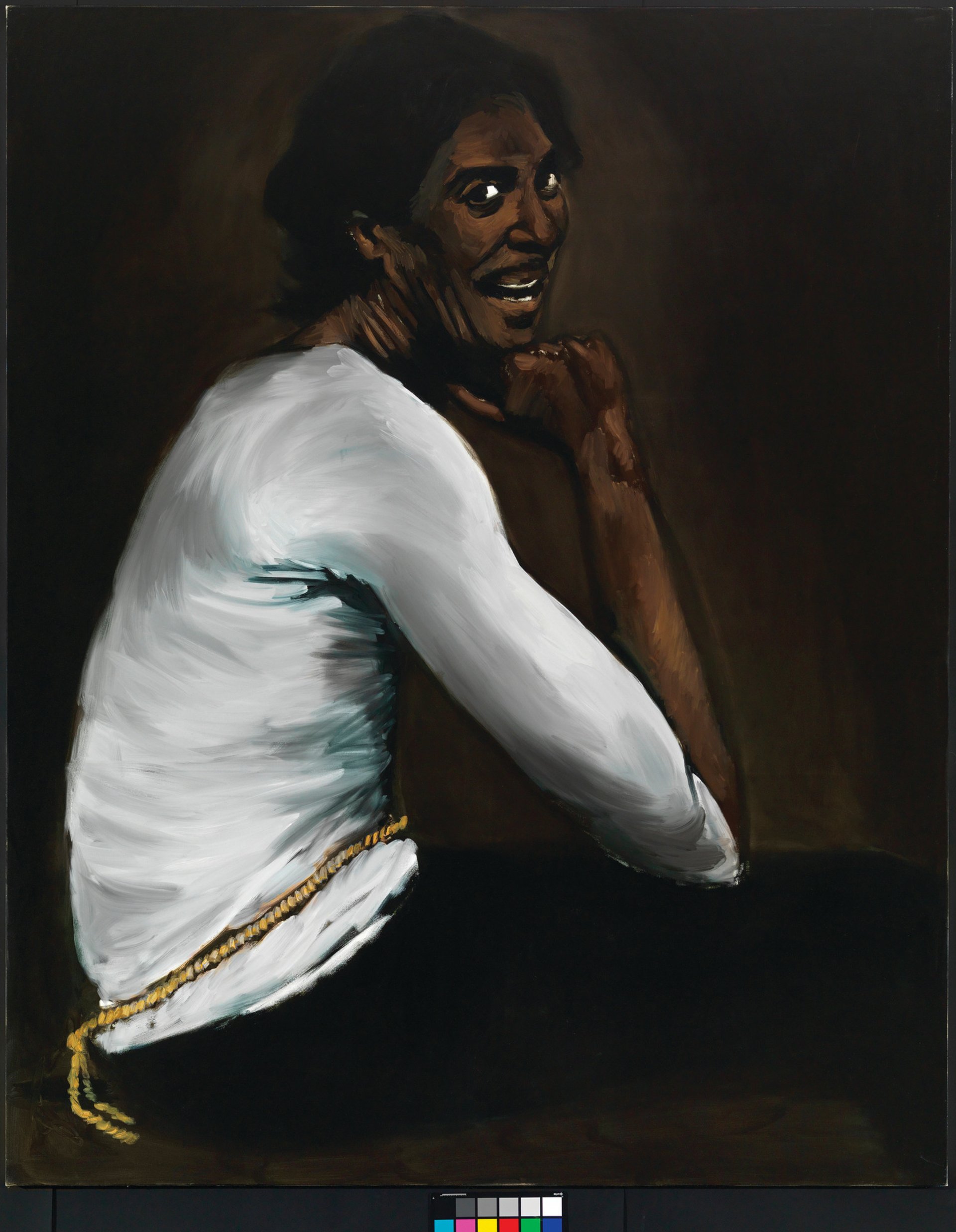 This large-scale and somewhat sinister man, wearing a loose white shirt and leering smile, has been a regular presence in Yiadom-Boakye’s work for the past few years, and often ushers in a new series of paintings. He tends to be painted (but not necessarily exhibited) in pairs, and is one of a wider cast of recognisable characters who recur in the artist’s paintings, wearing the same clothes but with subtle shifts in pose and expression. “When I start a body of work, I will do these two paintings, and each time there will be a slight variation, but essentially it’s the same man,” she says. “They are an anchoring of how I think generally and a reminder of where I am. It is also the sense of getting to know someone better. They have changed a lot since their first incarnations.”
