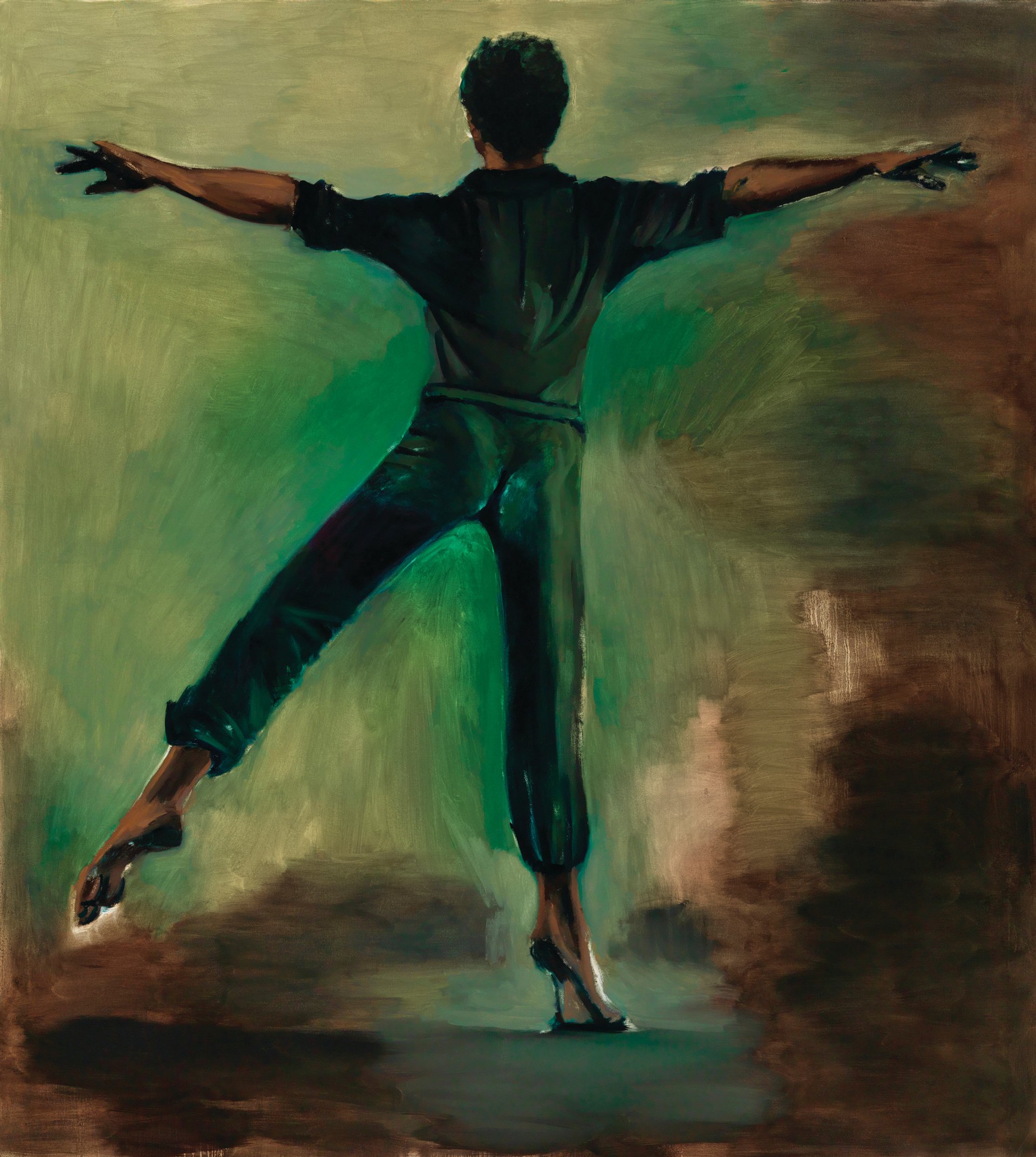 This is one in a series of paintings that nod to the dancers of Edgar Degas, who, along with Walter Sickert, Édouard Manet and John Singer Sargent, is frequently referred to by Yiadom-Boakye in her work. “I’ve been influenced by historic painters who share a certain devil-may-care mode of working, who were not so concerned with formal perfection or academic rules, but with the physicality of paint, the act of painting,” she says. The women in her earlier works were directly, even aggressively, frontal, but these dancers often turn their backs and avoid our gaze. “It’s deliberate that they’re not looking towards the viewer. They’re always looking away and you just get a sense of them,” the artist says. “I’m very careful about how female beauty appears. I like that they’re sensual and sexy and beautiful, but they’re not looking forward. They don’t give you everything.”