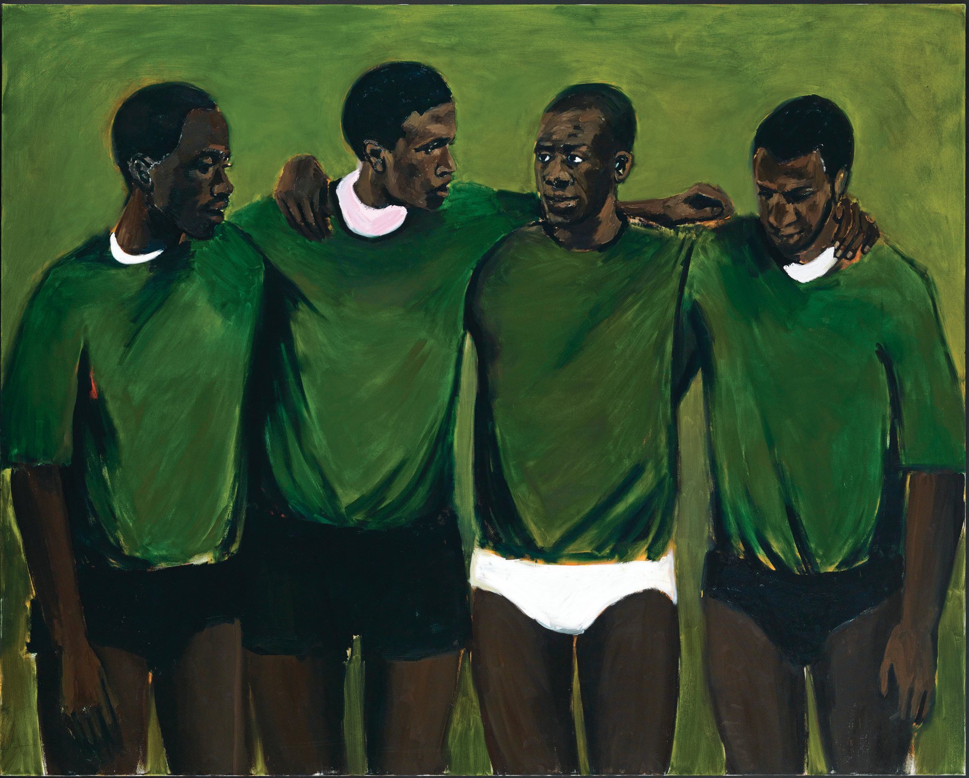 Four men wearing what looks like sports kit stand in a row, as if posing for a team photo. Enigmatic but evocative groups of figures form a significant strand in Yiadom-Boakye’s work. As with her single characters, any particulars of who they are or where they might be are kept to a minimum—here, it is not even clear whether they are indoors or outdoors—but they always seem to be absorbed in the moment.