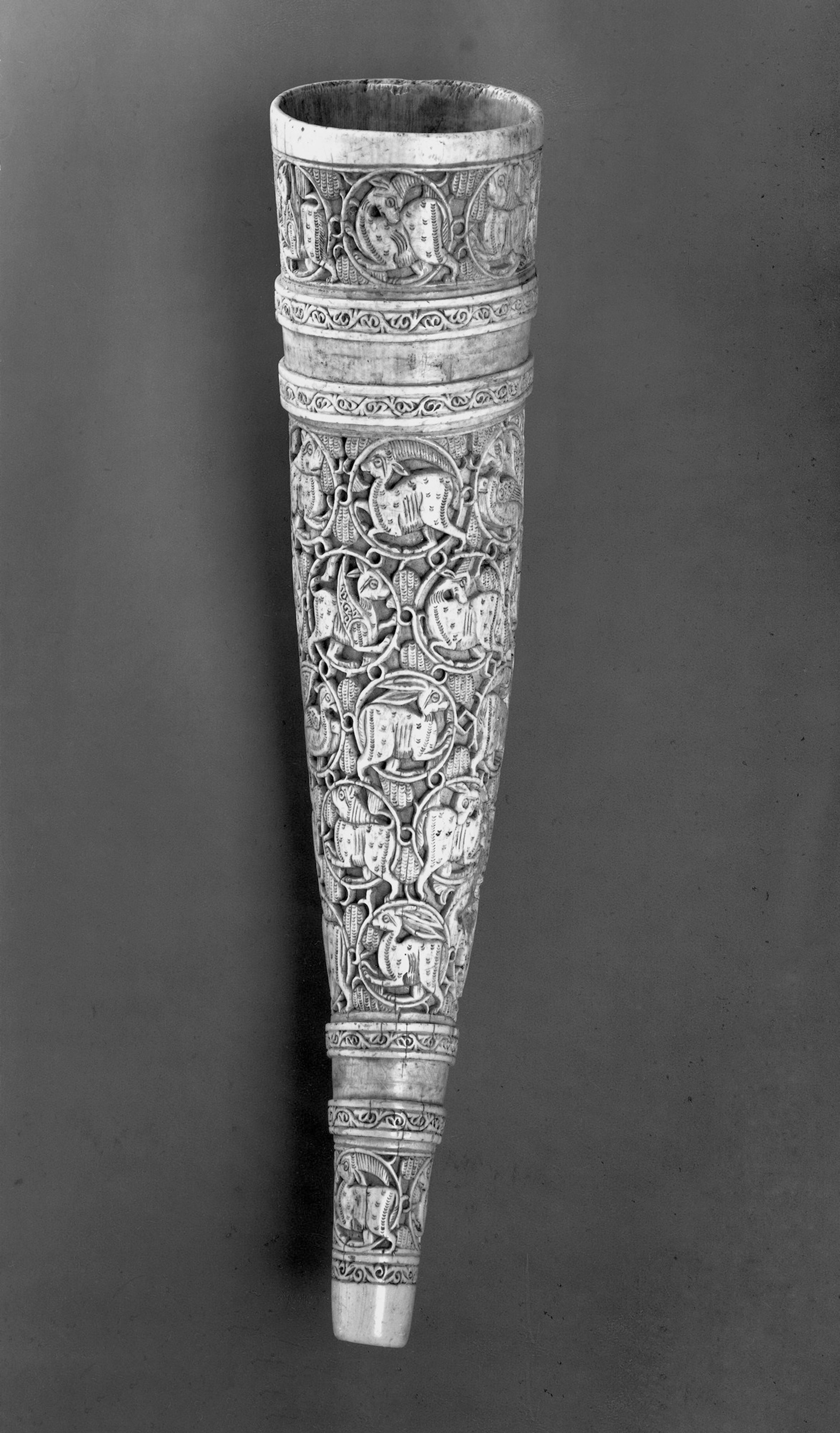 Shalem’s categories are perhaps unnecessarily complex. He assigns a group of 13 11th-century horns in the Fatimid style to possible origins in Egypt, southern Italy or Sicily. Five more are considered as definitely from Egypt. More than 20 pieces from the same period are then placed in a different class described as “archaicising” or in the antique style. We have another section for “hybrids” from southern Italy or Sicily, and some related pieces in “high Medieval” style, then a small number of central European and Nordic origin, and, finally a group without carved or incised décor. Appendices include two Coptic fragments, some Scandinavian walrus ivory and six horns of 16th-century or late Medieval date.