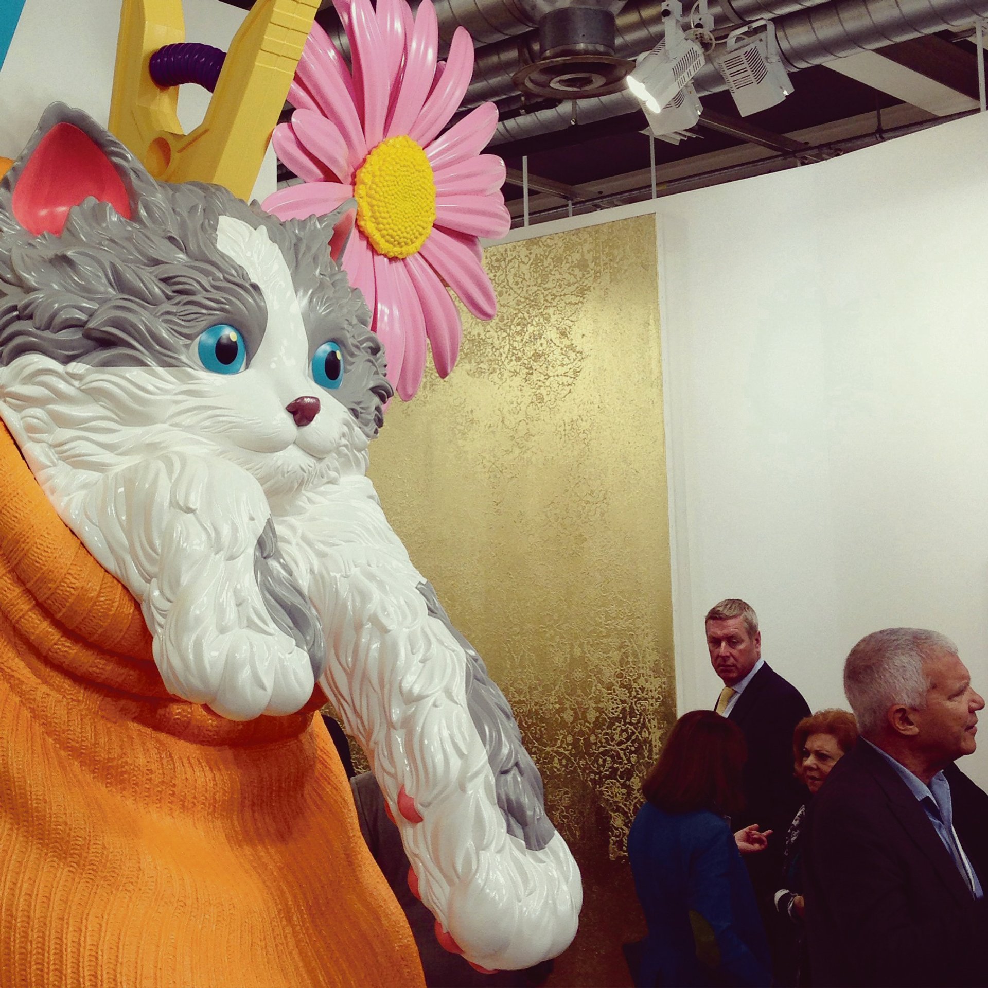 We’ve had such fun this week at Art Basel tweeting, Instagramming and Periscoping (don’t ask), and thought we’d give you a flavour of some of our online recommendations and nuggets. It is no surprise that posts featuring animals, from stuffed horses to ceramic chickens at Design Miami/Basel, were pure “clickbait”, but the biggest hit was this Instagram shot, which had the following fetching caption: A big pussy at the Gagosian booth: Jeff Koon’s Cat on a Clothesline (1994-2001) #ArtBasel #TANBasel #cat