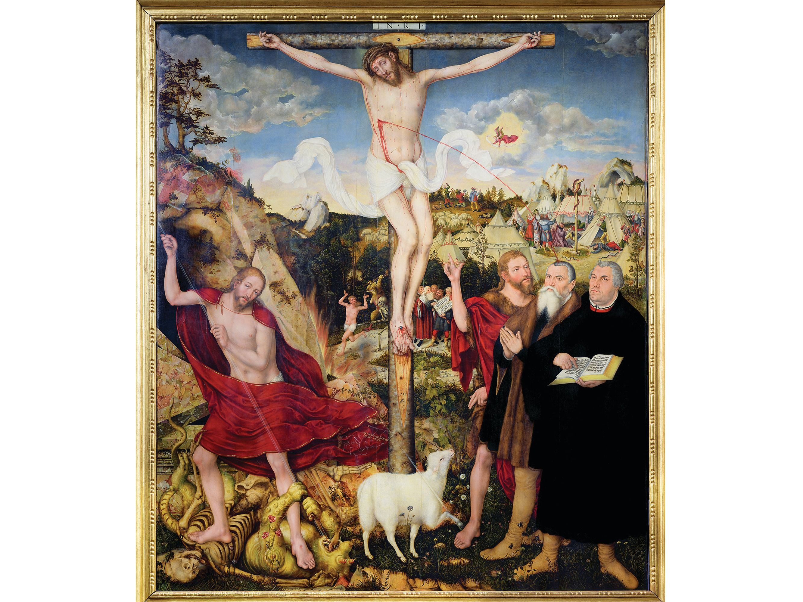 Originally thought to be the work of the elder Cranach finished off by his son, it is now recognised as the work of the son alone. It manages to encapsulate the entire programme of the Cranach workshop since its inception. The panels to the left and right depict Frederick the Wise, his family and successors. In the centre the figure of Christ on the Cross, the centre of a typical Gesetz und Gnade (law and grace) picture—with the condemnation of Catholic sinners on the left and the glorification of the virtuous Protestants on the right. The figures on the right are perhaps surprising but obviously important to the Cranachs: first St. John the Baptist, then Cranach the Elder, then Luther showing his printed Bible to the viewer. Any doubt about who was most important is dispelled by the stream of blood that flows from Christ’s side and lands on Cranach the Elder’s head.