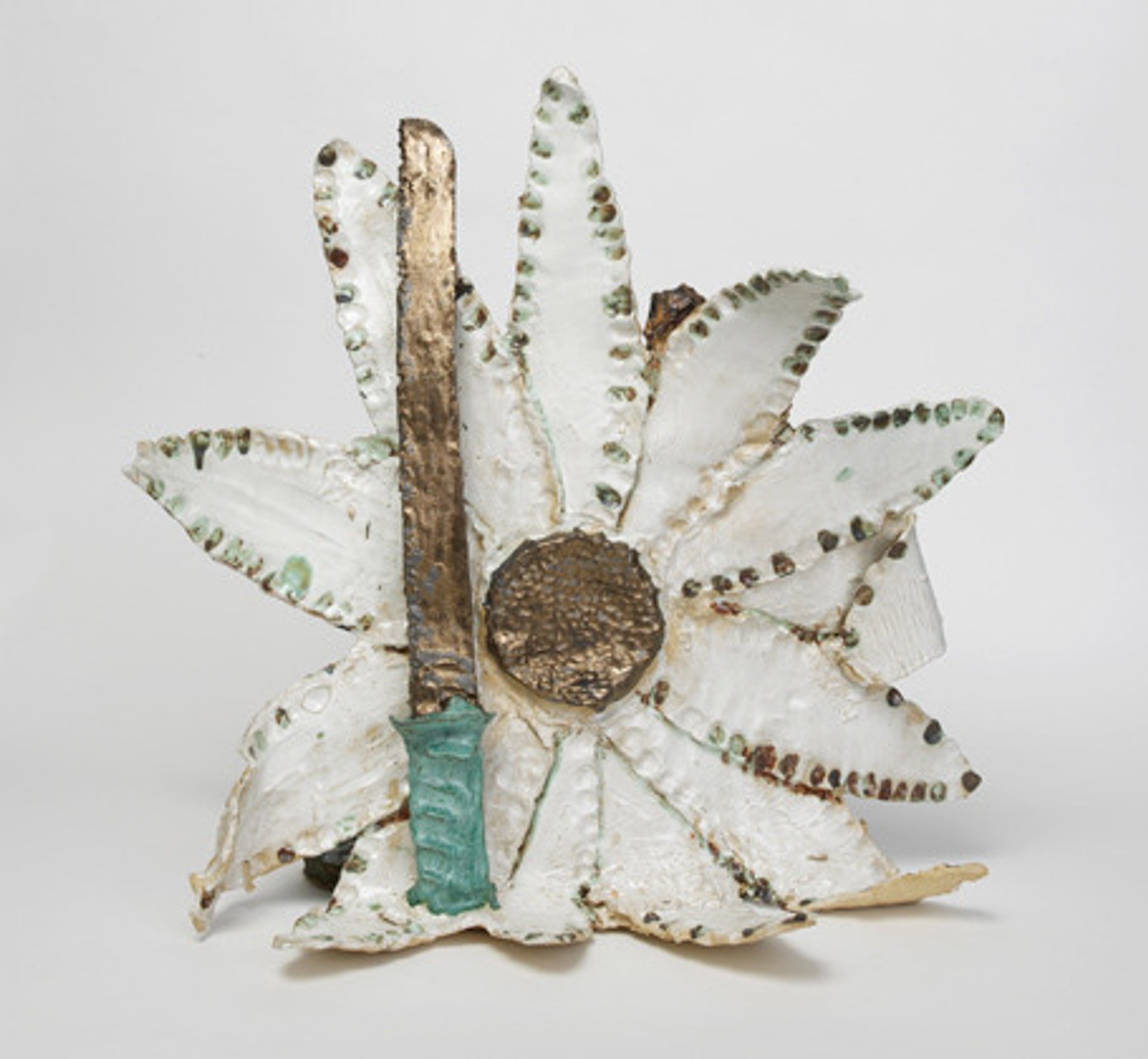 Who can resist an exhibition by an artist who runs a “radical and psychedelic ceramic workshop for artists”(a.k.a. Troy Town Art Pottery)? Or who cites influences ranging from the only magnolia-seed fossils ever found in England and Bram Stoker’s “awful final novel”, The Lair of the White Worm, to the Cherhill White Horse landmark (which apparently for many years owed its single glass eye to the artist’s 19th century ancestor Farmer Angell)? Suffice to say that Aaron Angell’s largest commission to date does not disappoint and that his arcane sources and his multifarious media—pottery, appliqué, embroidery, sheet metal, mouldy white sliced bread, flecked paintings on glass—all mesh together to form a bizarre but also cohesive and compellingly ritualistic whole.