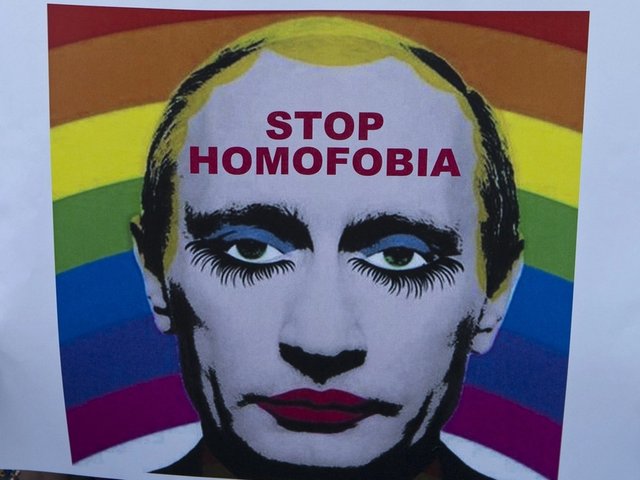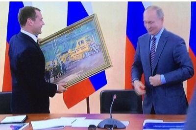 Although Romanovskaya’s blog includes many photos of her and her prodigious, um, tools, her portrait of Putin is totally safe for work, portraying the president fully dress in a suit and tie.
