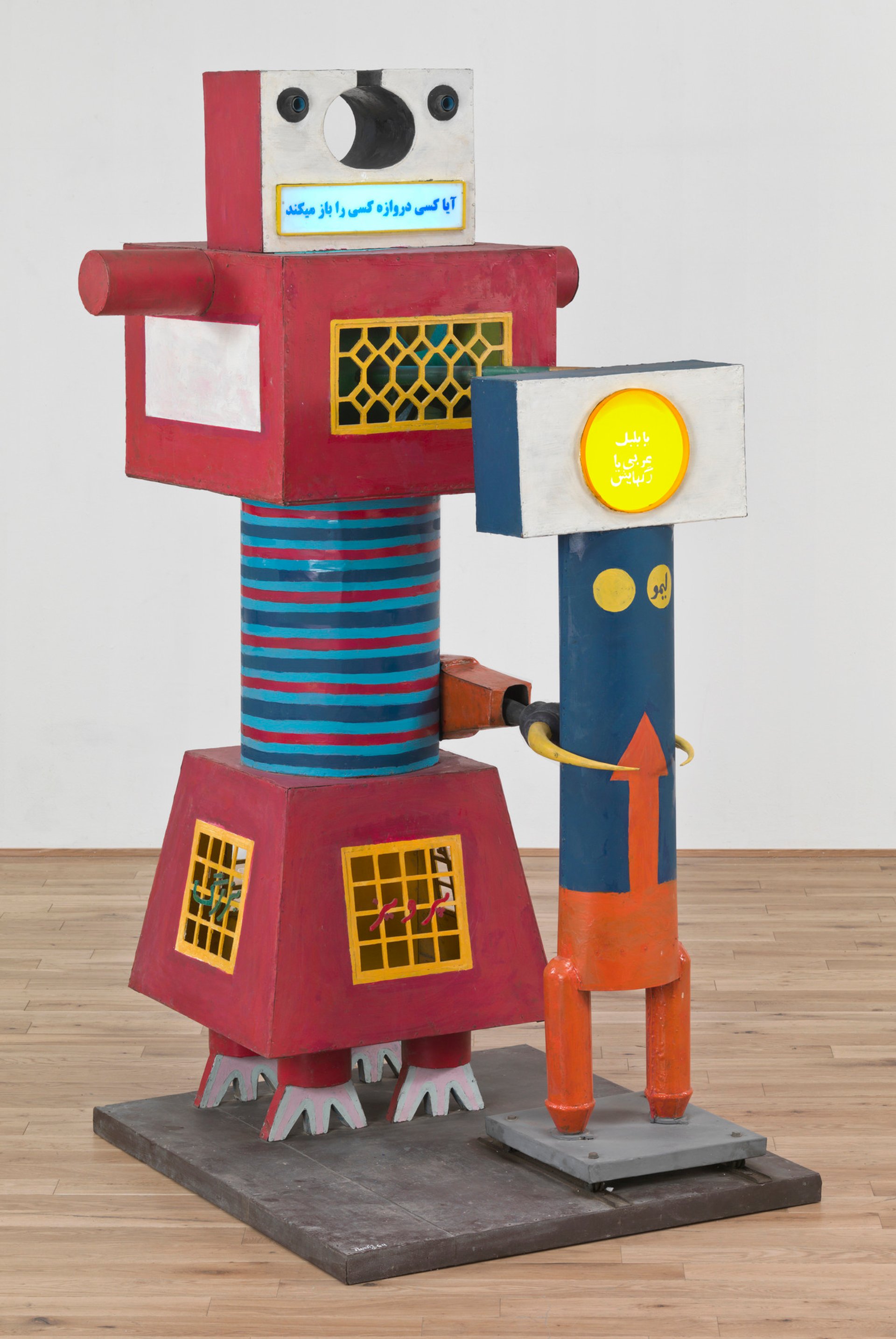 Flavia Frigeri, the co-curator of The World Goes Pop, writes in the exhibition catalogue that “the lack of a sculptural legacy in Iran made it all the more challenging for Tanavoli to develop three-dimensional Pop works while keeping with tradition. The answer came in the guise of folk pop, a marriage of pop with traditional handicraft.” A key sculpture in the show, The Poet and the Beloved of the King (1964-66), incorporates household elements such as grills.
