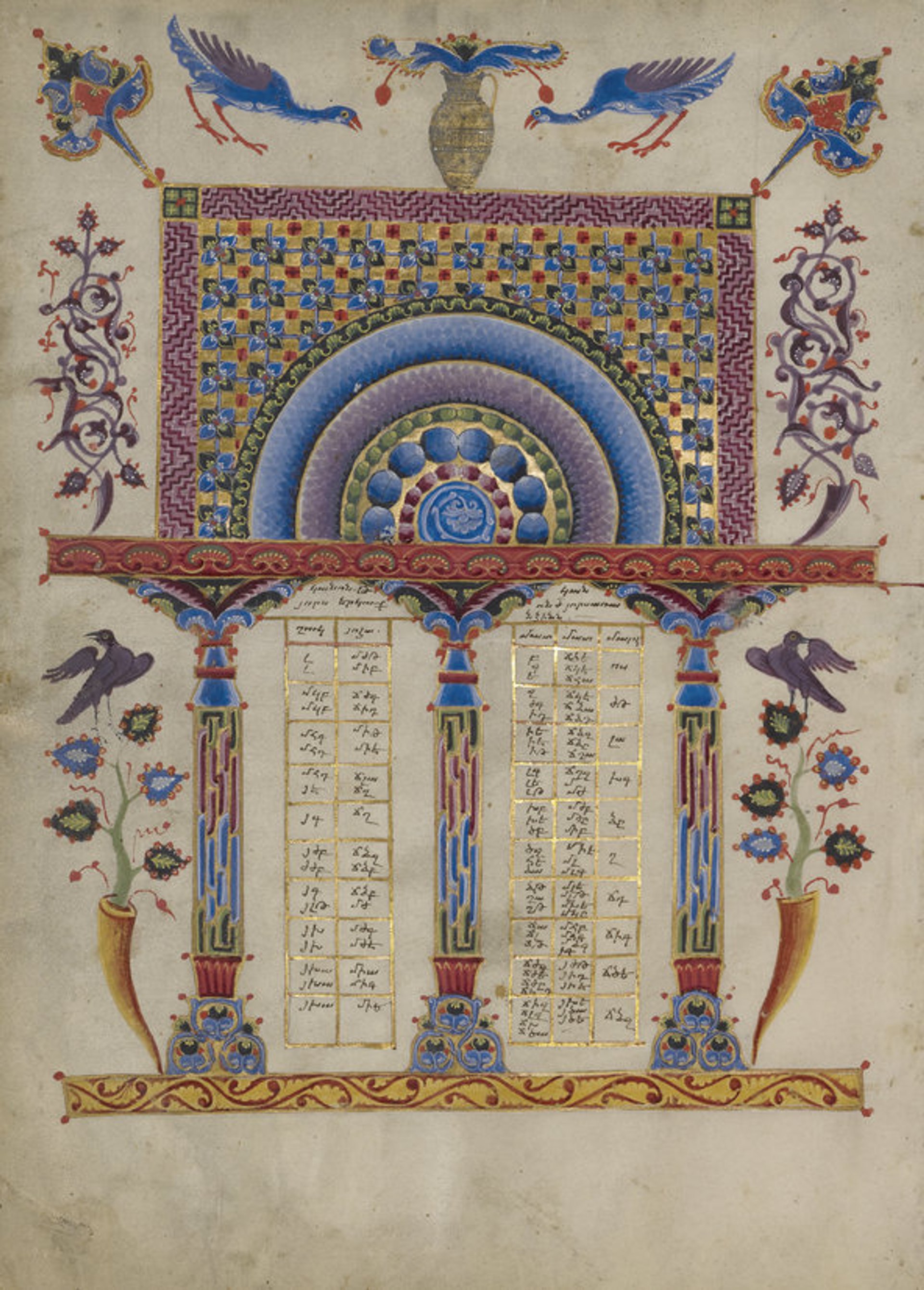 The pages, called the Canon Tables, comprise the table of contents for an Armenian Bible known as the Zeyt’un Gospels. They are the earliest signed work of T’oros Roslin, the most celebrated illuminator and scribe in Armenia in the 13th century. Armenia established an independent church in the fourth century, and the Gospels are among its most sumptuously illustrated texts.