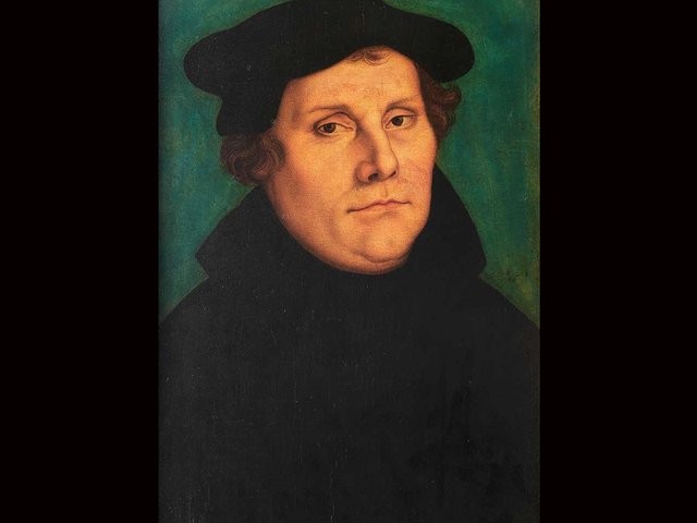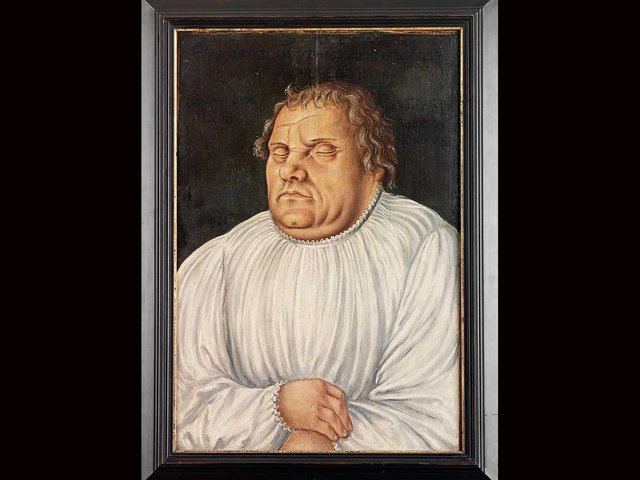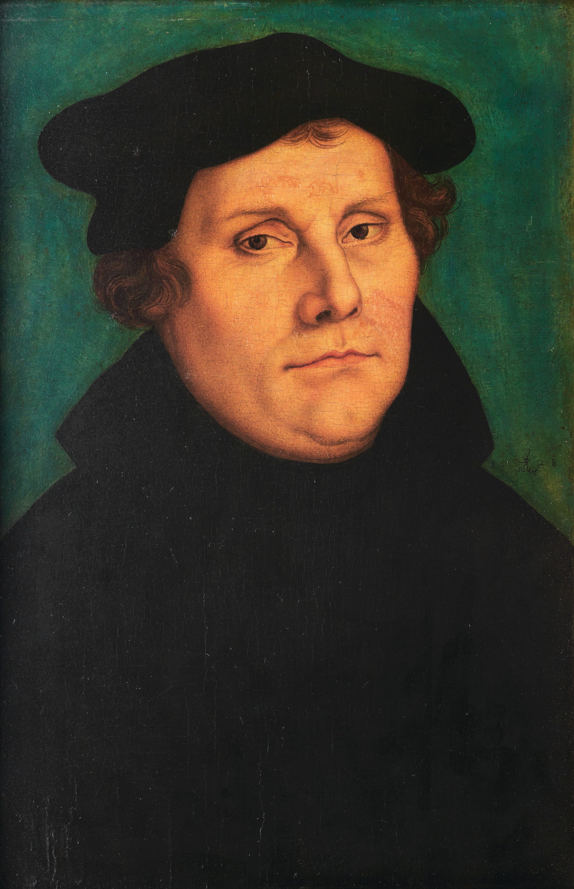 The catalogue follows the accepted chronology of portrait types. Cranach the Elder first produced a print of Luther as an Augustinian monk in 1520: a serious-minded, sensitive young man. The second image shows him wearing his doctor’s hat. The third depicts him in disguise as Junker Jörg (Lord George), without scholarly or ecclesiastical dress. Then we have the moving portraits of Luther and his wife: images of an ordinary couple, suffused with a quiet dignity, designed to scotch Catholic rumours that Luther had married a monstrous harlot.