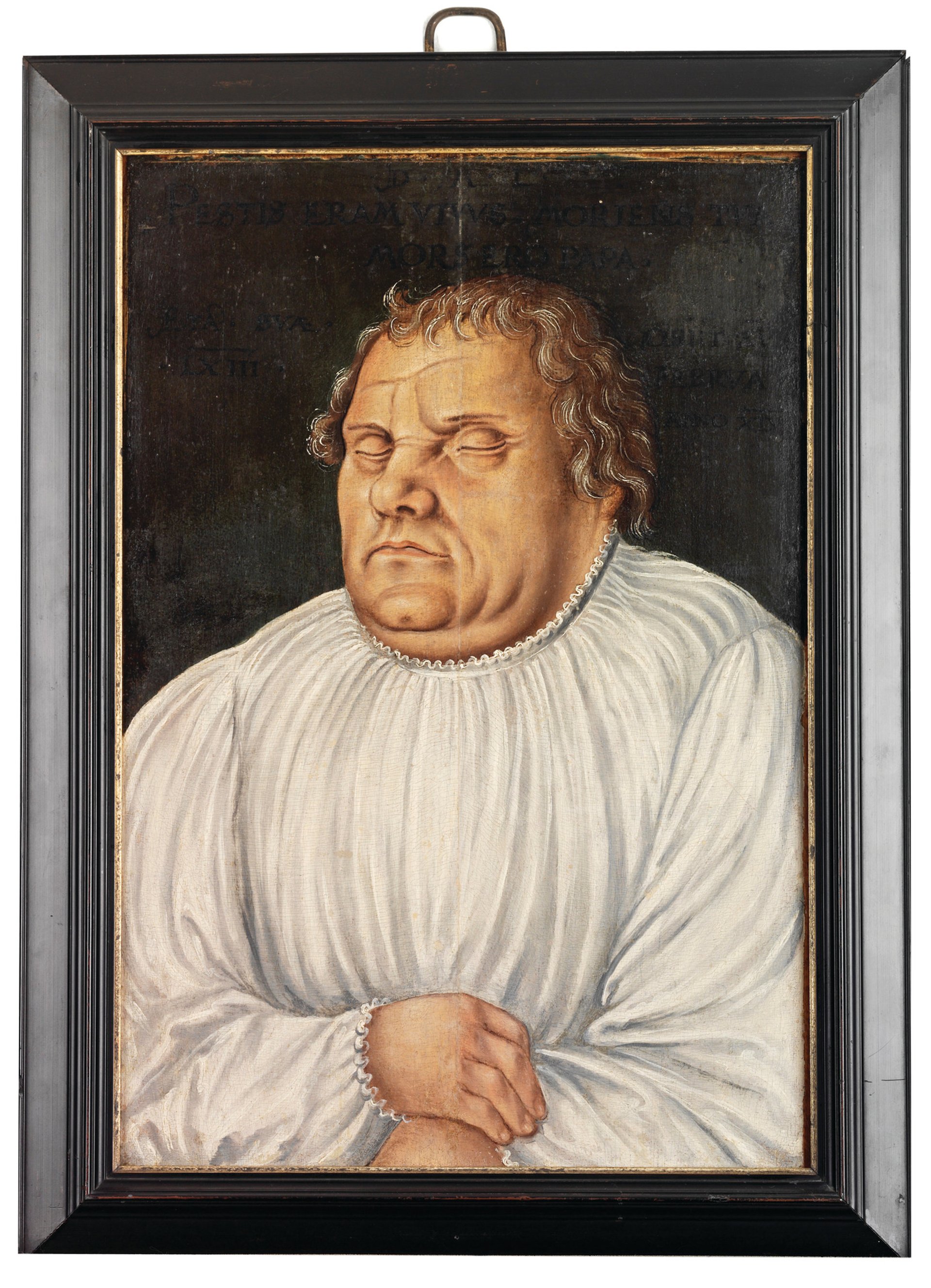 Cranach, Luther und die Bildnisse (Cranach, Luther and the Portraits), the catalogue of the Eisenach exhibition, focuses on the Cranach Luther portraits and their reception since the 16th century. It details the techniques of quality control the Cranachs used in the production of their images. A trace outline of Luther’s face marked with ink was used to ensure that the image remained constant and that the message was accurate. The images were rapidly translated from one medium into another and marketed. The Cranachs never failed to respond to a political or commercial opportunity. They painted marvellous naturalistic portraits of Luther but they were also masters of image management and brand control.