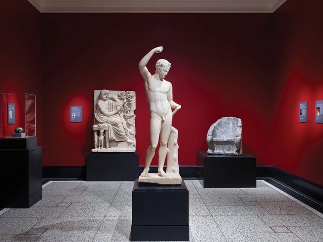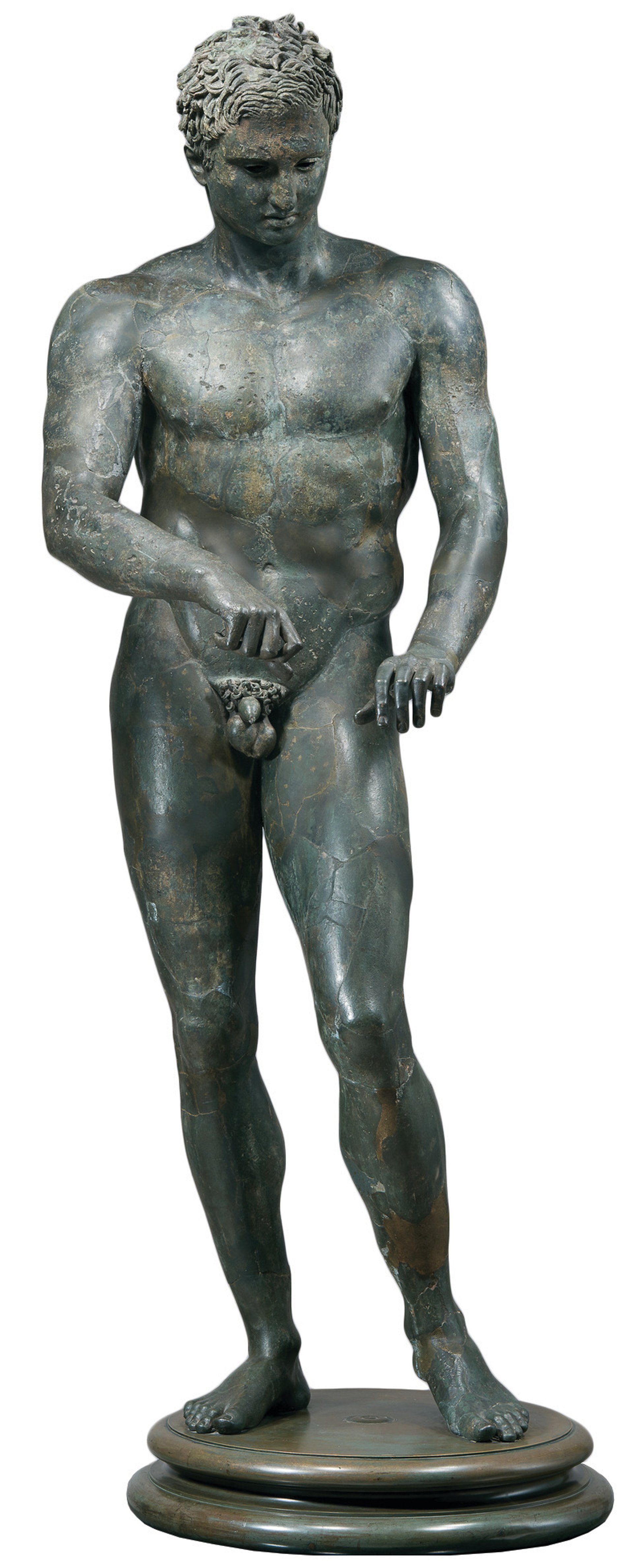 Apoxyomenoi (“the scrapers”) refers to the post-performance ritual of athletes, who would remove sweat and dirt from their skin with a strigil—a metal tool with a curved blade. The figures on show seem to be cleaning their strigils, but the tools themselves are missing. The Croatian athlete was found off the country’s coast in 1996 by a Belgian dentist on holiday.