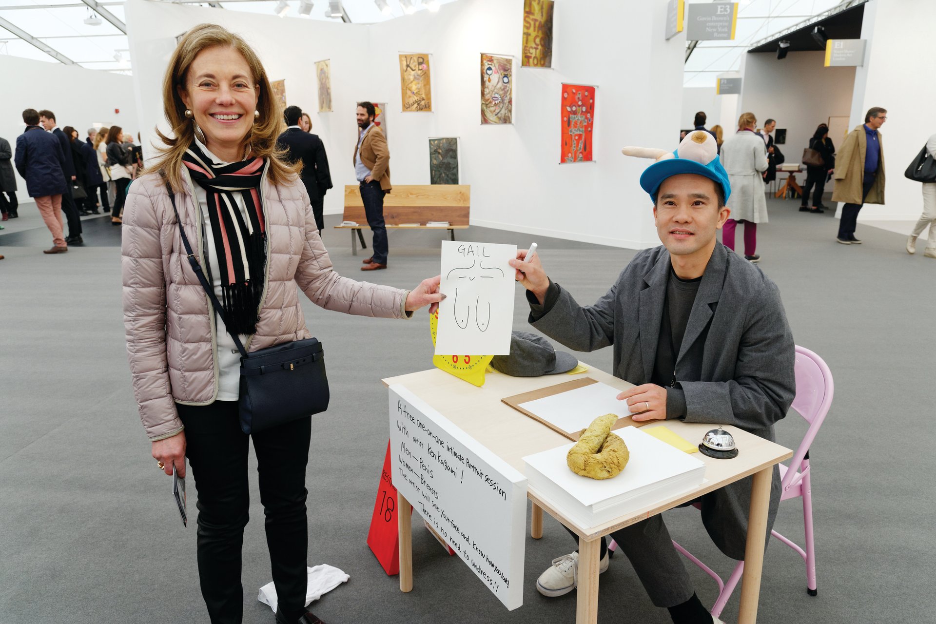 Who said sexual stereotyping was dead? Gender specificity is taken to its furthest extreme in the artist Ken Kagami’s free daily one-on-one “intimate portrait sessions”, Tokyo-based Misako & Rosen’s contribution to Frieze Live (FL, G19), in which the artist creates on-the-spot renditions of his sitters according to their sex, with males immortalised in the form of a penis, and females interpreted only as variously shaped breasts.