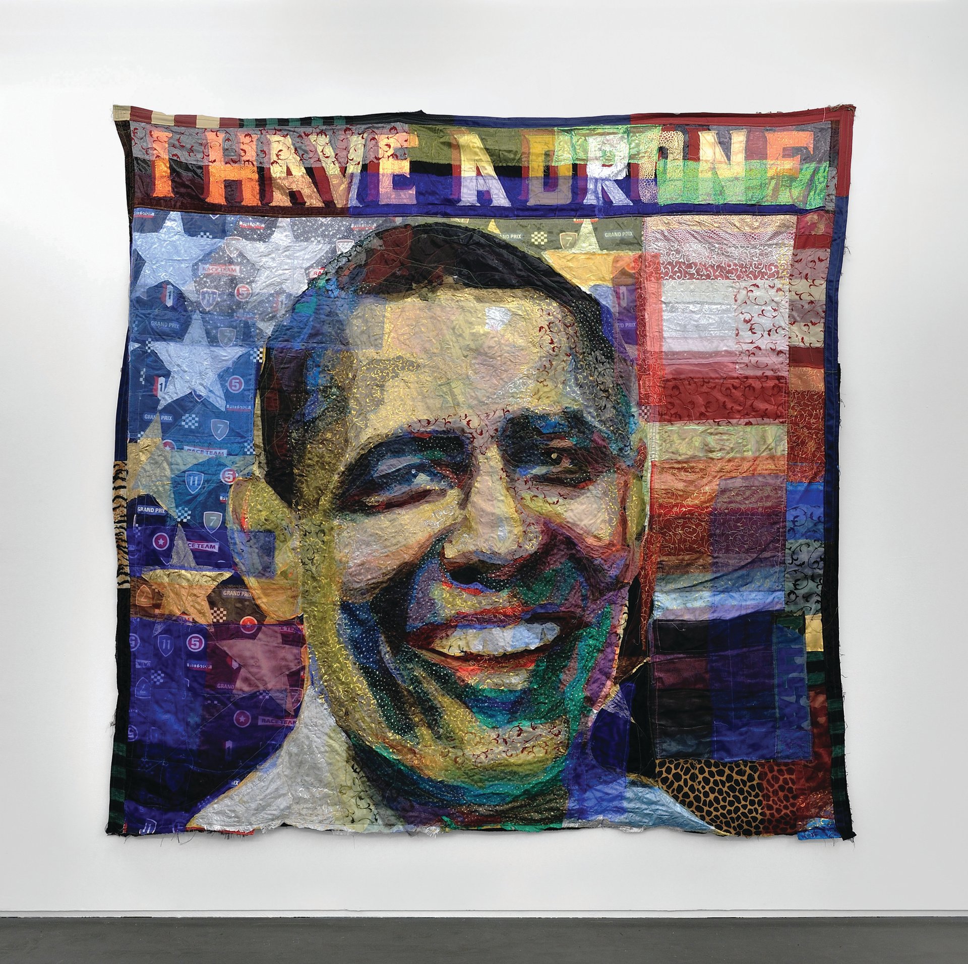 The France-based artist Hassan Musa is no stranger to controversy, having created the outlandish image in 2002 of Osama Bin Laden posing butt-naked on a US flag. Musa flies the flag again with another provocative piece at 1:54 Contemporary African art fair at Somerset House courtesy of Paris dealer Galerie Maïa Muller (until 18 October), which shows a beaming President Barack Obama against the stars ‘n’ stripes, with the words “I have a drone” emblazoned along the top of the eye-popping textile. One visitor was so shocked, she uttered: “What the hell would Martin Luther King think?”