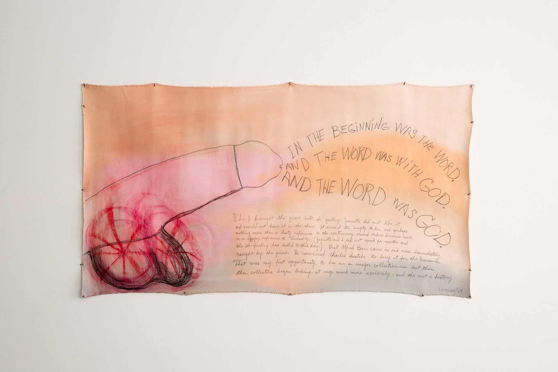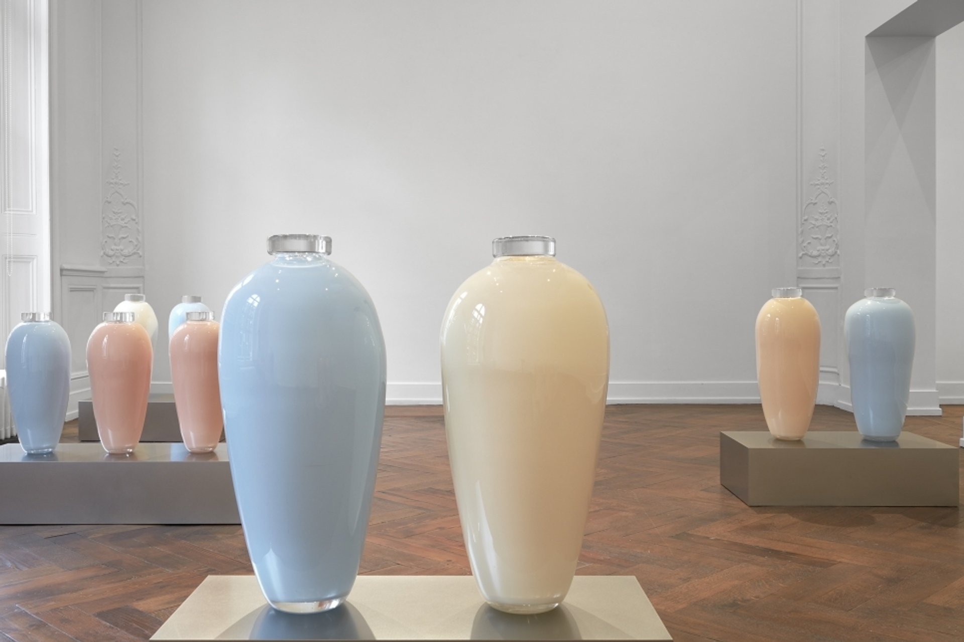 Over at Massimo Di Carlo another new body of work presents groupings of large hand-blown clear glass urns. These contain an assortment of pastel-coloured powders—peach, pink, mint-green, powder blue—that turn out to be the actual pigments used to coat pills in the latest generation of HIV medicines. They are arranged in groups of one, two and three, depending on the daily-prescribed pill dosage and combination of medicines. These highly appealing sweetie-coloured vessels are placed on low rectangular stainless steel plinths and play with, and off, the austere, clinical language of minimalism. They also chime beautifully with the gracious rooms and rococo plasterwork of the gallery’s Mayfair mansion home. But their aesthetic appeal and art historical resonances are also firmly underpinned by the deadly serious fact that these drugs, while prolonging life, also carry their own acute side effects. Another by-product is that because HIV is no longer considered a fatal disease, it is now no longer discussed, despite the shocking fact that one in eight gay men in London are currently estimated to be HIV positive.