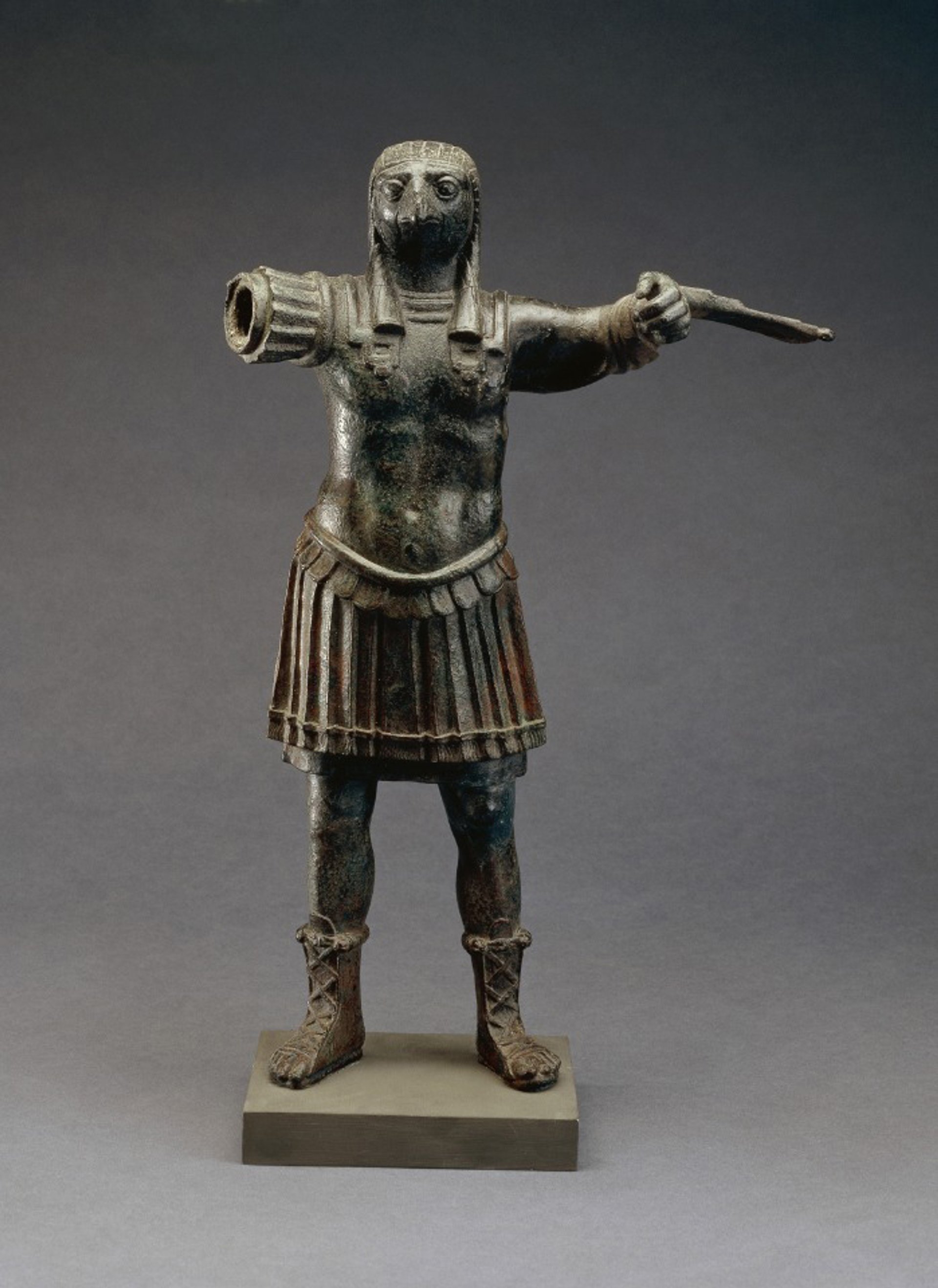 Among the 200 pieces on display are objects such as a first or second-century bronze statue of the falcon-headed Egyptian god Horus wearing a Roman cuirass (body armour), a Roman lamp carved with a menorah, and a set of sixth or seventh-century linen curtains with Christian and Roman motifs, showing the intermingling of cultural and religious influences.