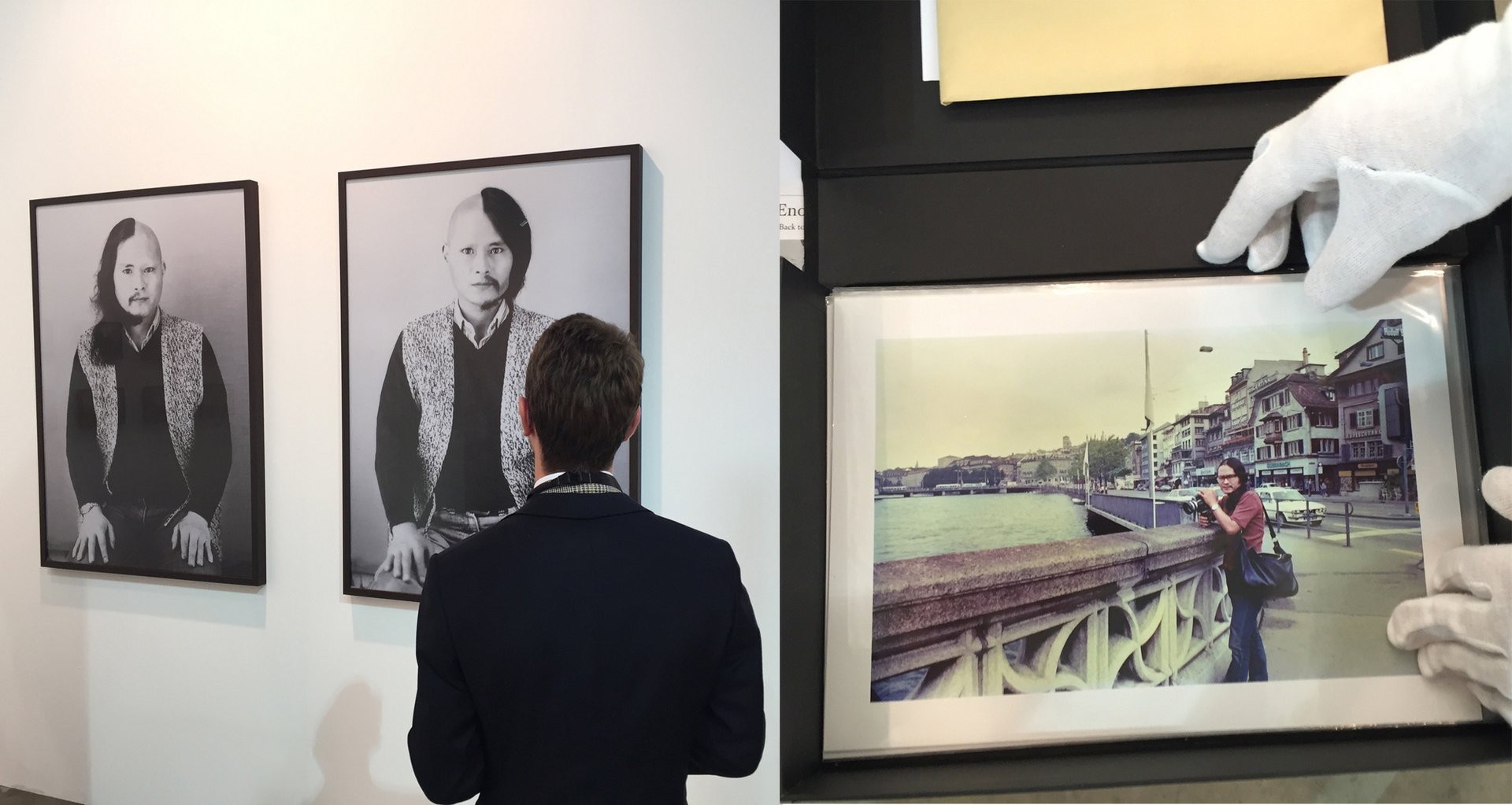 Gabriel de la Mora at Timothy Taylor Gallery This is the London gallery’s first time at the fair, “and we’ve only heard good things,” says one of their salespeople, Alexandra Leive. “It’s also quite a slow-burning fair, which is quite refreshing.” On their stand is work by the mid-career Mexican artist Gabriel de la Mora, notably a colourful metal triptych made from a repurposed floor that was salvaged from a derelict colonial house in Mexico City. The work sold for $50,000 on the opening night. Also by the same artist is a series of small, vintage photographic “intervention” pieces, such as the cheeky one in the foreground above, which are selling for $8,000 each.