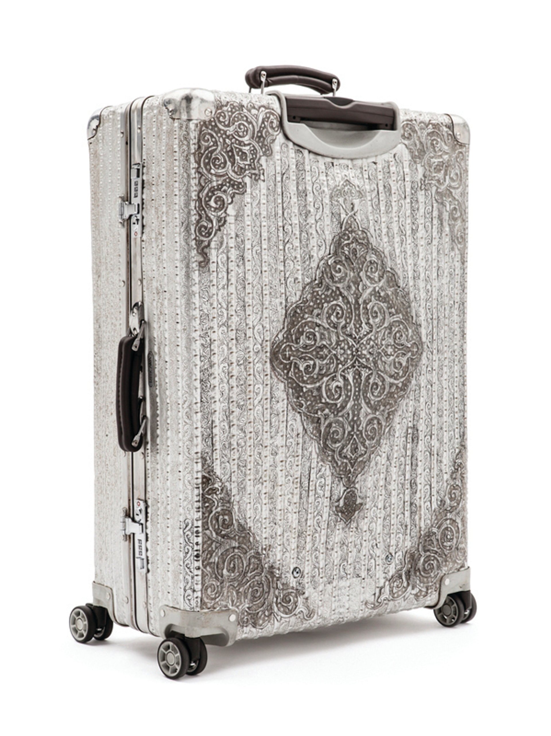 The show will feel like a retrospective, Delvoye says, but it will also include new metalwork pieces made by Iranian artisans in the city of Isfahan. These include a series of aluminium Rimowa-brand suitcases, embossed with traditional designs by craftsmen who more typically work in silver or brass, as well as the frame of a Maserati sports car decorated in a similar style. Other pieces, such as car-tyre sculptures and Delftware gas cylinders, reflect the artist’s subversive approach to brand-name culture.