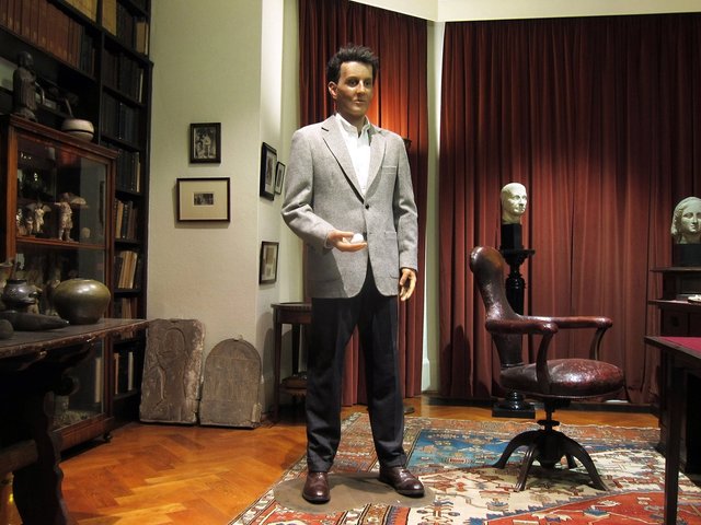 Other Turk interventions include large scale photographs of billowing ectoplasmic smoke, redolent both of Dr. F’s cigar habit as well as notions of free association; three neon works spelling out the Freudian buzzwords, id, ego, and super-ego; and the introduction into an upstairs room of Turk’s own studio desk, covered with personal memorabilia in ironic homage to Freud’s antiquity-laden counterpart down below. There is even a miniature bust of Turk-as-Freud cheekily ins erted in to one of the study’s crammed vitrines. All of which was especially interesting to Turk’s friend, and conceptual art pioneer, Joseph Kosuth. The latter’s work has been deeply influenced by Wittgenstein’s theories of language, and in 1989 he even curated a special exhibition at the Vienna Secession to mark the 100th anniversary of the philosopher’s birth. Thankfully, Mr. Kosuth seemed to be of the opinion that Wittgenstein would have heartily approved of Turk’s interrogatory, but affectionate, take on his fellow philosophical great.