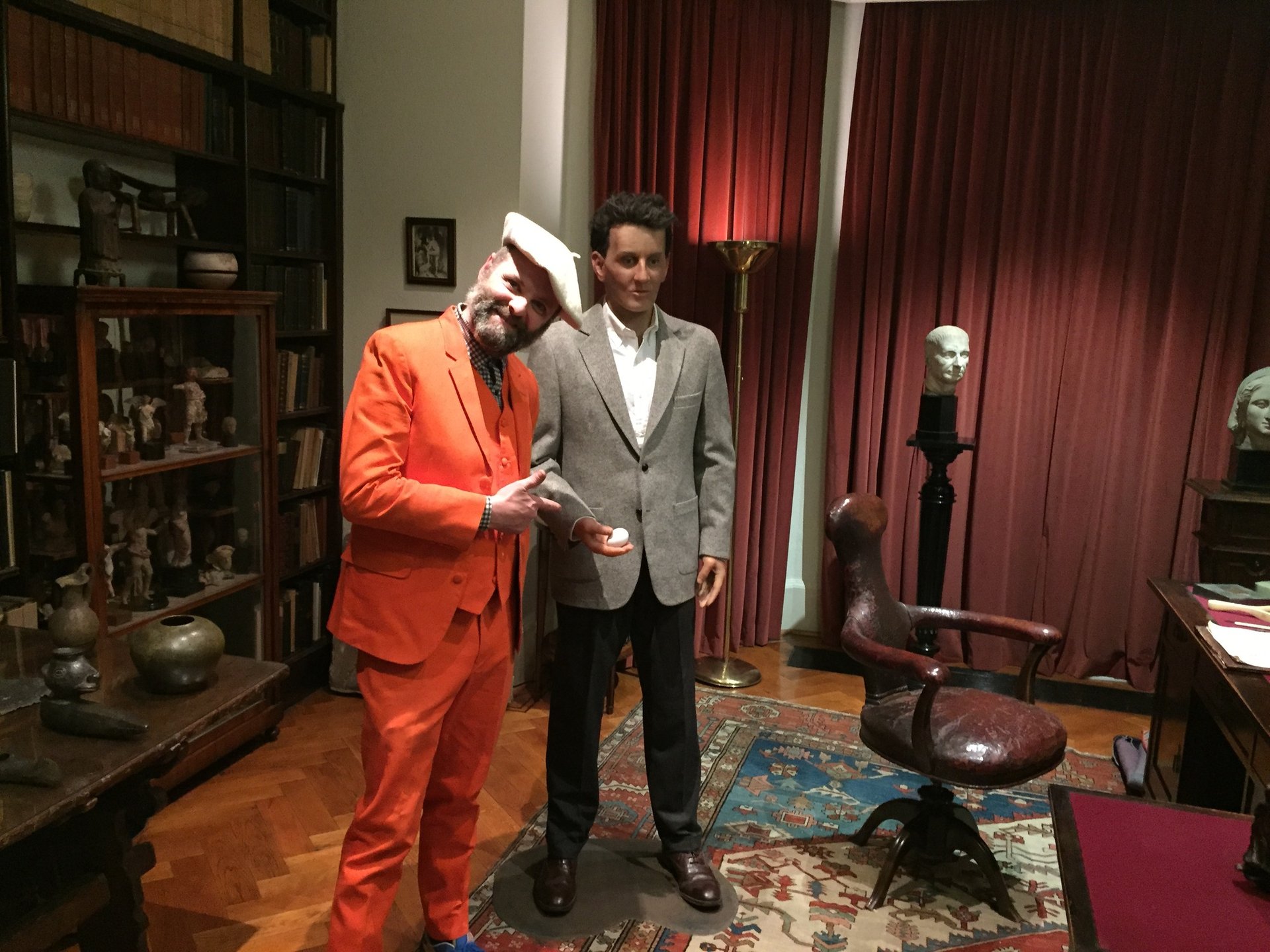 Illustrious names past and present were in attendance at last night’s (25 November) pre-preview dinner of Gavin Turk’s exhibition, Wittgenstein’s Dream (until 7 February 2016), at the Freud Museum in Hampstead. Joseph Kosuth, Richard Long, Cornelia Parker, Tate curator Andrew Wilson and Deutsche Bank’s Alistair Hicks were among the luminaries gathered to inspect the fruits of what Turk described as his “micro-residency” in the last home of the founding father of psychoanalysis. Most notable of the artist’s interventions, was the highly-charged introduction of a life-sized waxwork of fellow Austrian—and Freud-skeptic—Ludwig Wittgenstein into the hallowed sanctum of Freud’s study. The tweed-jacketed philosopher stands just across from the iconic couch, enigmatically cradling an egg in his hand. At tonight’s private view the ante will be further upped when, in a one-off performance, this interloper is joined by a Freudian doppelganger, slumped across the great man’s desk.