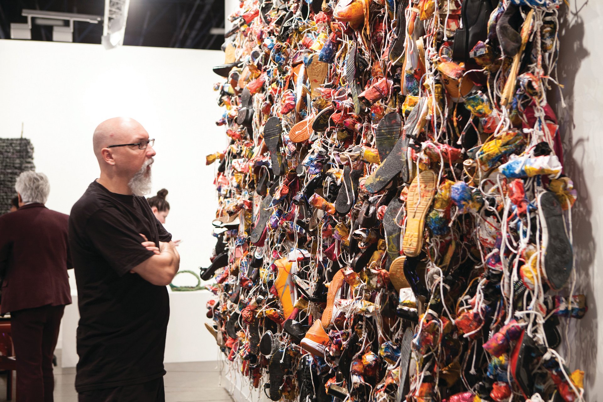 Elizabeth Dee (J15) has brought a selection of haunting paintings of refugees by Miriam Cahn (ranging from 1973 to 2014, $14,000-$30,000). In the stand-out solo booth of works by the Dubai-based artist Hassan Sharif at Alexander Gray (K3; prices range from $20,000 to $200,000), his installation of mass-produced shoes recalls the movement of people who do not belong anywhere.
