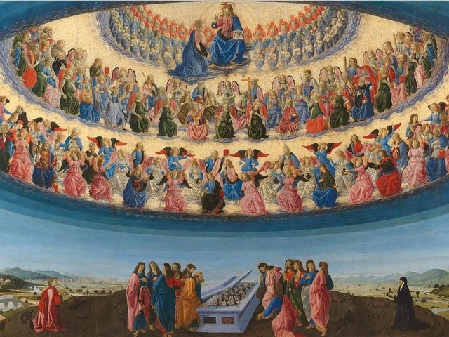 Between 1420 and 1430, theatre designers working in churches began to build multiple platforms, each of which moved independently. Heavenly choirs and God would be represented on various layers of moving clouds, while angel messengers could descend separately from a church’s dome to the stage below. Buccheri sees a direct translation of this design in paintings such as Francesco Botticini’s Assumption of the Virgin (1475-76), in which Mary, released from her grave, ascends towards the dome atop a single floating cloud.