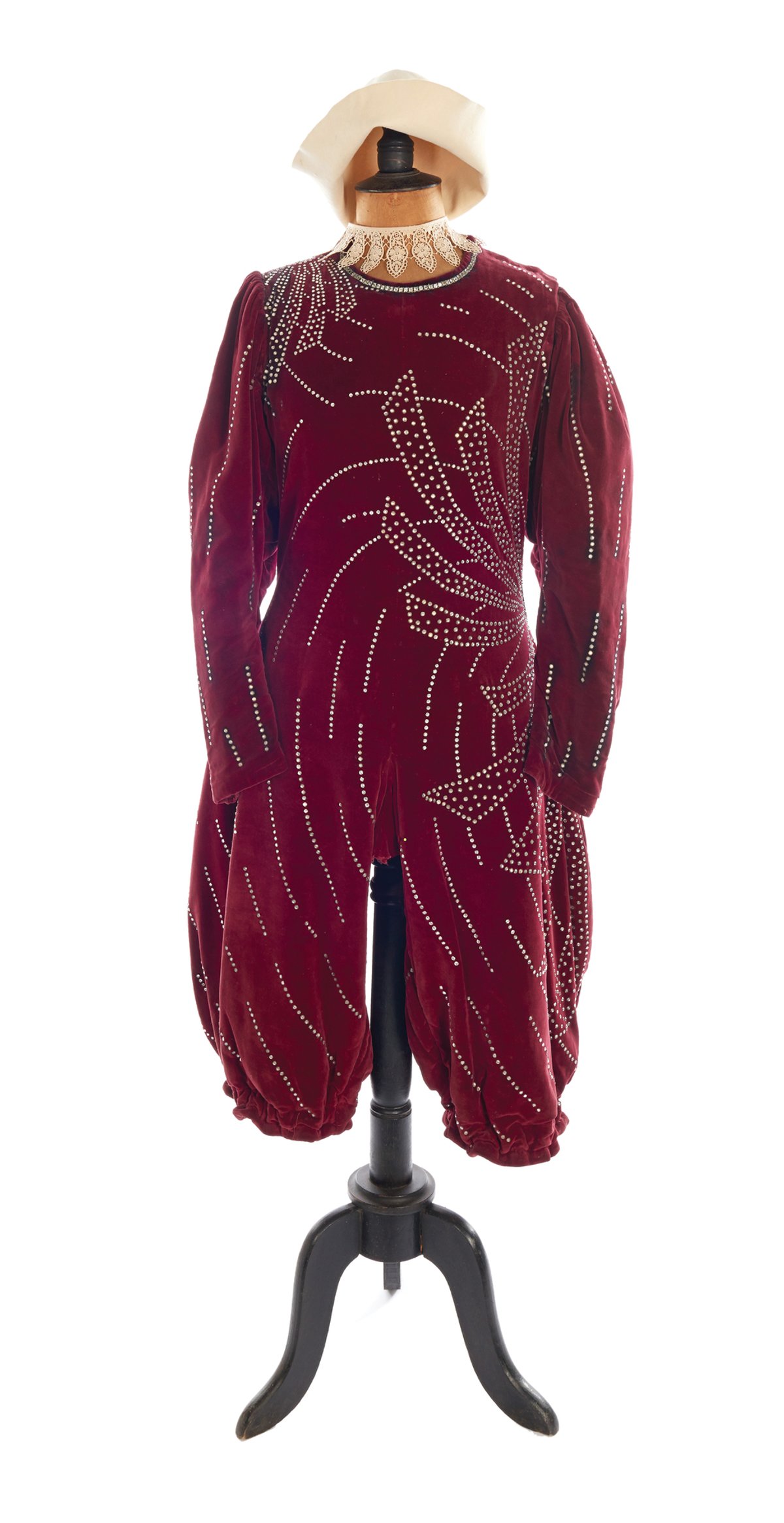 A pi François and Albert. Around 100 photographs, works of art, posters and various other objects commemorate the trio, who toured Europe with their circus act and starred at the Cirque Medrano in Paris between 1915 and 1924. Their spectacular show was not only popular with the public, but also with Parisian intellectuals and artists, including Pablo Picasso, Jean Cocteau and Raoul Dufy. This 1920s red velvet costume belonged to François, who played the traditional role of the elegant, pompous, whiteface clown. Embellished with a swirling diamante pattern and lace collar, the one-piece suit was made by his wife, Jeanne Peres, a horsewoman. It is expected to sell for between €4,000 and €6,000.
