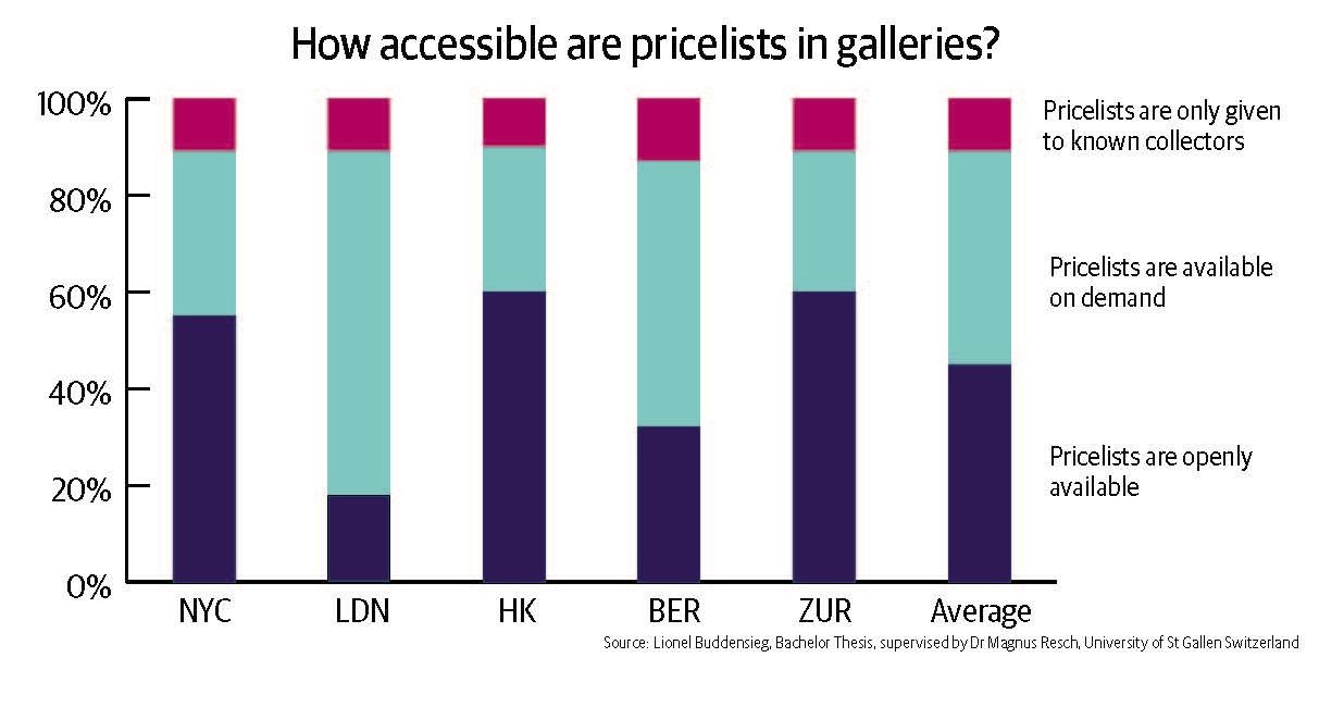 Meanwhile, data compiled by the author and art market researcher Magnus Resch, with the University of St Gallen, Switzerland, suggests that galleries are yet to heed the warning. Resch’s analysis of 400 galleries in New York, London, Hong Kong, Berlin and Zurich shows that price lists are openly available in fewer than half of spaces.