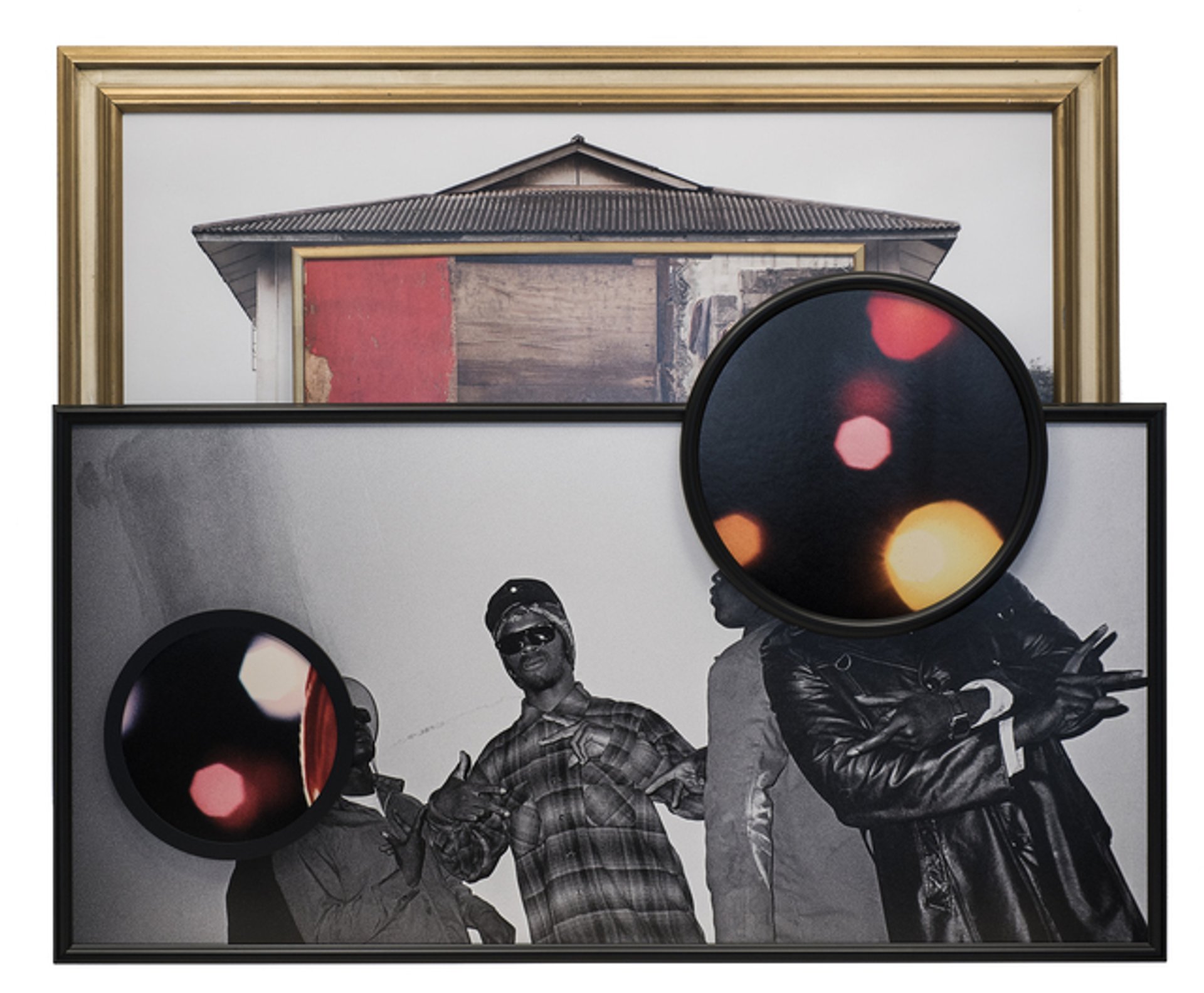 And he has found ways to combine his documentary photography (some from Ghana) with his older celebrity shots (many of the King of Pop himself). The gimmick: Gray layers these photos not within a single frame, but places frames on top of, and also inside of, other frames. And he uses round picture frames much like John Baldessari uses round stickers, to block out a subject’s face and punch holes in the emerging narrative. The assemblages run $7,500 to $19,500, with two sold opening night.