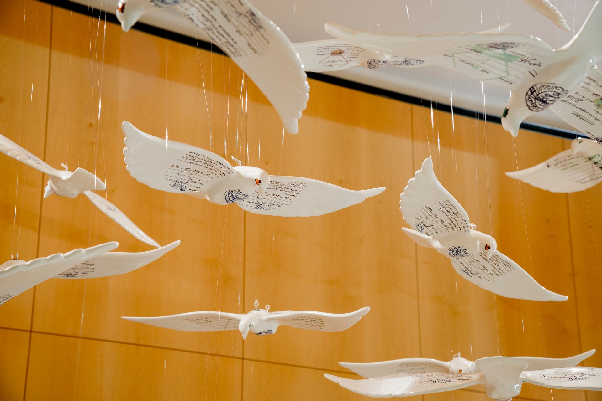 The first work that visitors encounter, Manal Al Dowayan’s installation Suspended Together (2011) refers to Saudi Arabian women’s limited civil rights. They cannot travel abroad without permission from a male guardian. The bodies of the 124 fibre-glass doves are embedded with official travel documents obtained by female Saudi intellectuals, artists and scientists.