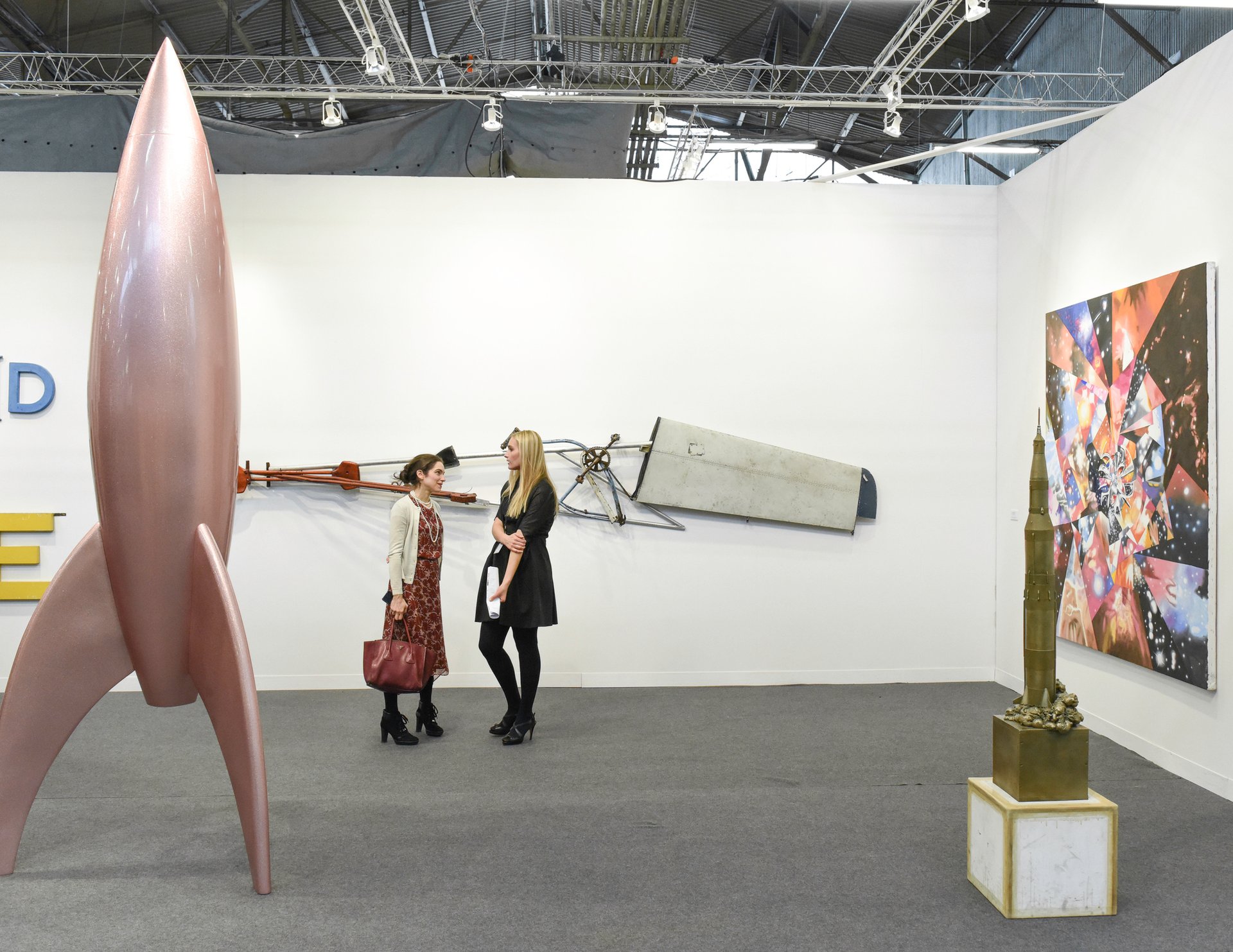 The gallery is also showing a large-scale diptych Robert Longo, Untitled (Cosmonaut Tereshkova, First Woman in Space) (2015), Jules de Ballincourt’s Space Investors (2015) and a smaller garbage rocket by Tom Sachs Saturn V, (2011). These are accompanied by older works by James Rosenquist, Richard Artschwager and Robert Rauschenberg, who created a wall-mounted sculpture that resembles a sort of broken flying machine. Ropac said almost all the works in the booth besides those older ones were commissioned by the gallery. The historic works are a bit more expensive too—$1m for Rosenquist’s and $1.5m for Rauschenberg’s.