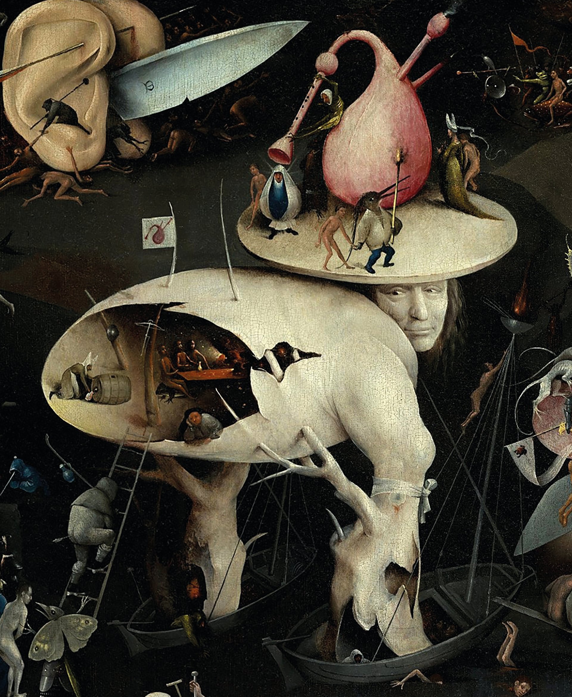 Bosch does not point his finger at the sinner. Instead, he shows the absurdity of sin through, for example, creatures such as the Tree-Man. The egg-shaped abdomen of a pale giant, who has dead tree stumps for legs and has stuffed his feet into rickety boat shoes, houses an “evil inn” (see below). The figure peers over his shoulder as he sticks out his buttocks—an all too clear symbol of the impurity of sin and the stench of hell. On his head, which is by far the grandest part of the body, he sports a disc that bears lustful sinners and a demon promenading around a bagpipe—a symbol of the male sex drive.