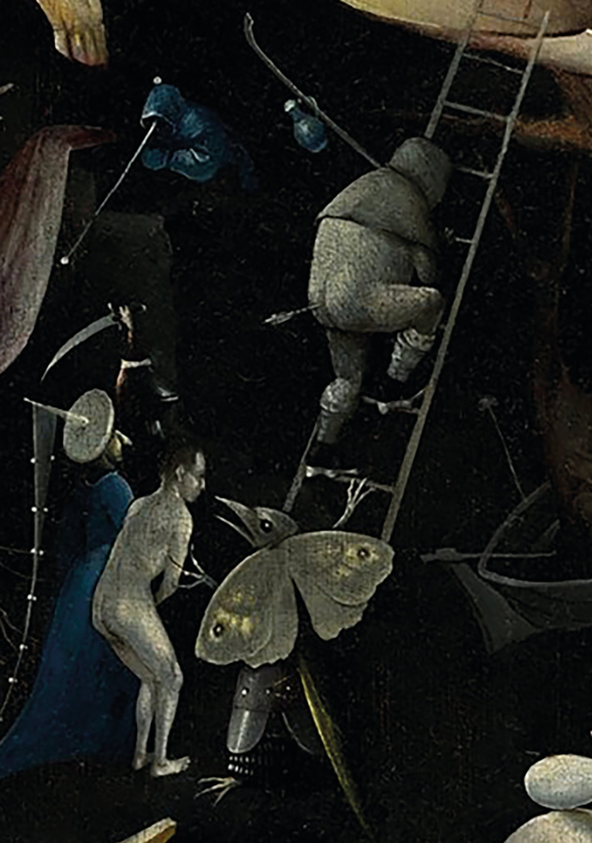 Hell is dominated by the theme of the “evil inn”. Often seen in literary references at the time, the term applied to brothels and shady taverns where patrons were exposed to any number of vices such as secular music, unlicensed gambling, unlimited amounts of alcohol and prostitution, any combination of which could lead to sinful behaviour. The evil inn was the antithesis of the Christian ideal, and as such, any believer would do their best to avoid this wicked place. It does, however, provide the painter with pictorial possibilities, namely the creativity to combine parts of things and living beings to show the hubris and the chaos of evil. For example, a demon with a bird’s head and butterfly wings, dressed as a knight, holds the ladder for two lost souls, one with an arrow painfully protruding from his buttocks, as they climb into the inn.