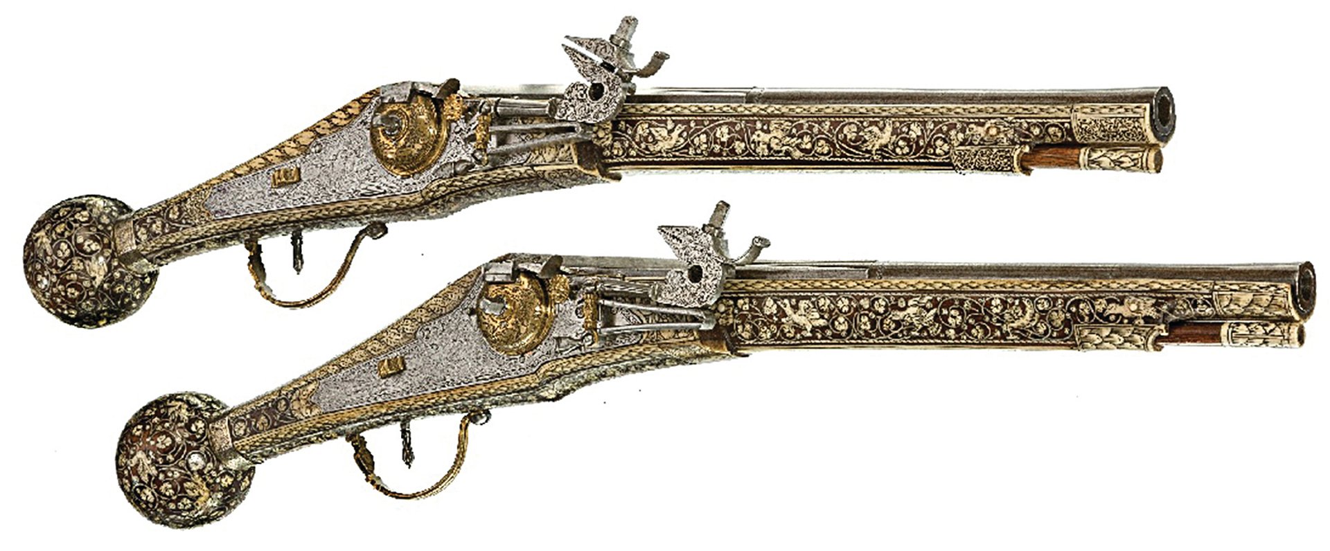 This pair of ivory-inlaid wheel-lock pistols was made in 1596 by Christoph Dressler for Friedrich Wilhem I, the Duke of Saxe-Weimar, to wear with court dress; although they are working guns, they would not have been intended for ordinary use, being so highly decorated. They are also in almost mint condition because they come out of the Electors of Saxony’s great display armoury, created to proclaim their role as arch-marshals of the Holy Roman Empire. Saxony is in East Germany and under its post-Second World War communist regime, the armoury sold many items to fund the Dresden museums. Peter Finer is asking a six-figure sum for the pair.