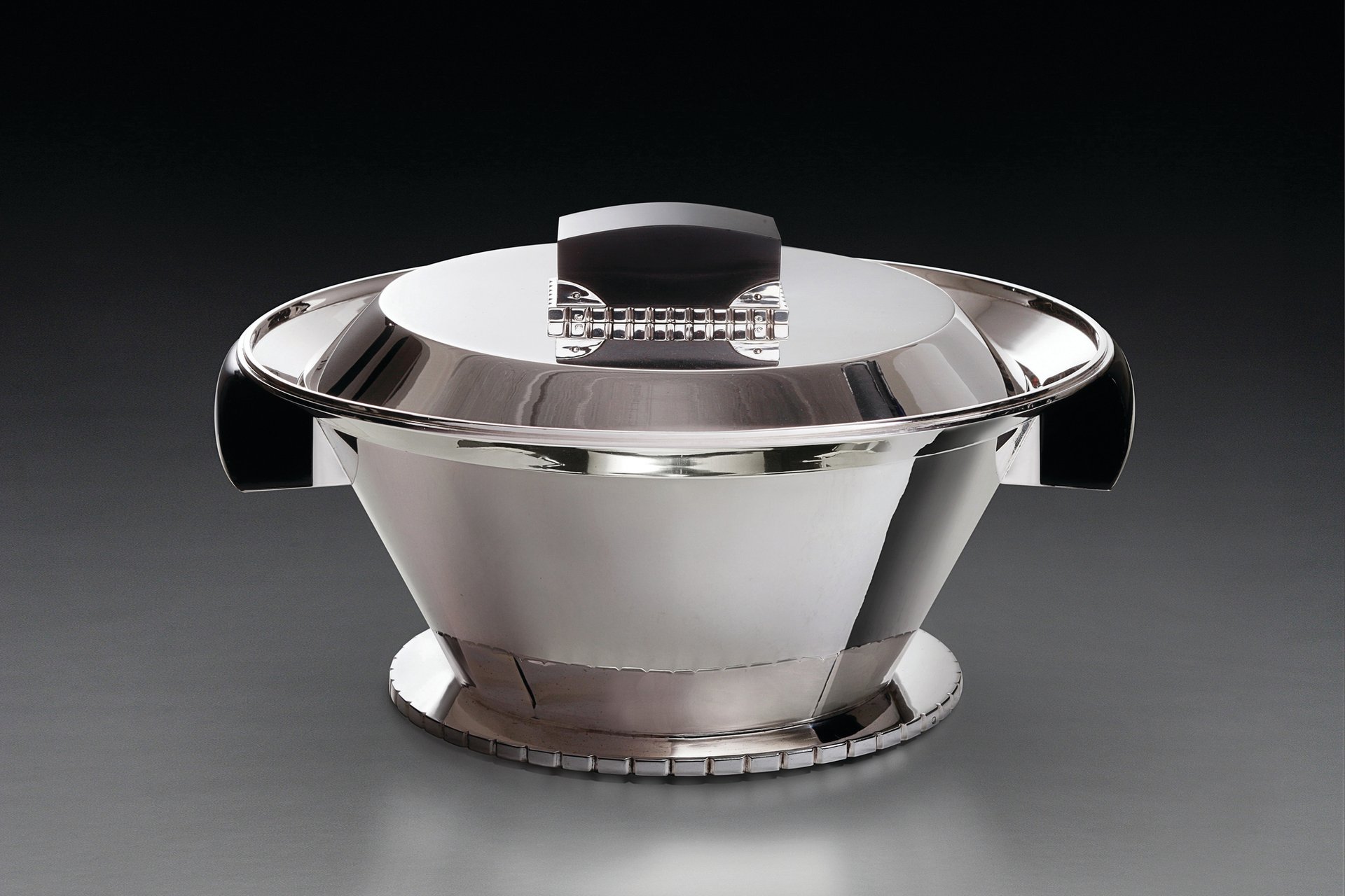 Jean Puiforcat came from a family of French silversmiths and studied both silversmithing and sculpture. The silver that he designed is considered the best of Art Deco in that material. As with this silver and marble soup tureen, his work is often angular, inspired by the five Platonic geometric forms, and he was a committed Modernist, one of the founding members in 1929 of the influential Union des Artistes Modernes, to which architects such as Le Corbusier and designers such as Jean Prouvé and Robert Mallet- Stevens belonged. Andy Warhol made a large collection of this work in the 1970s, when Art Deco was not considered particularly original or important. The Belgian dealer is asking €58,000 for the piece.